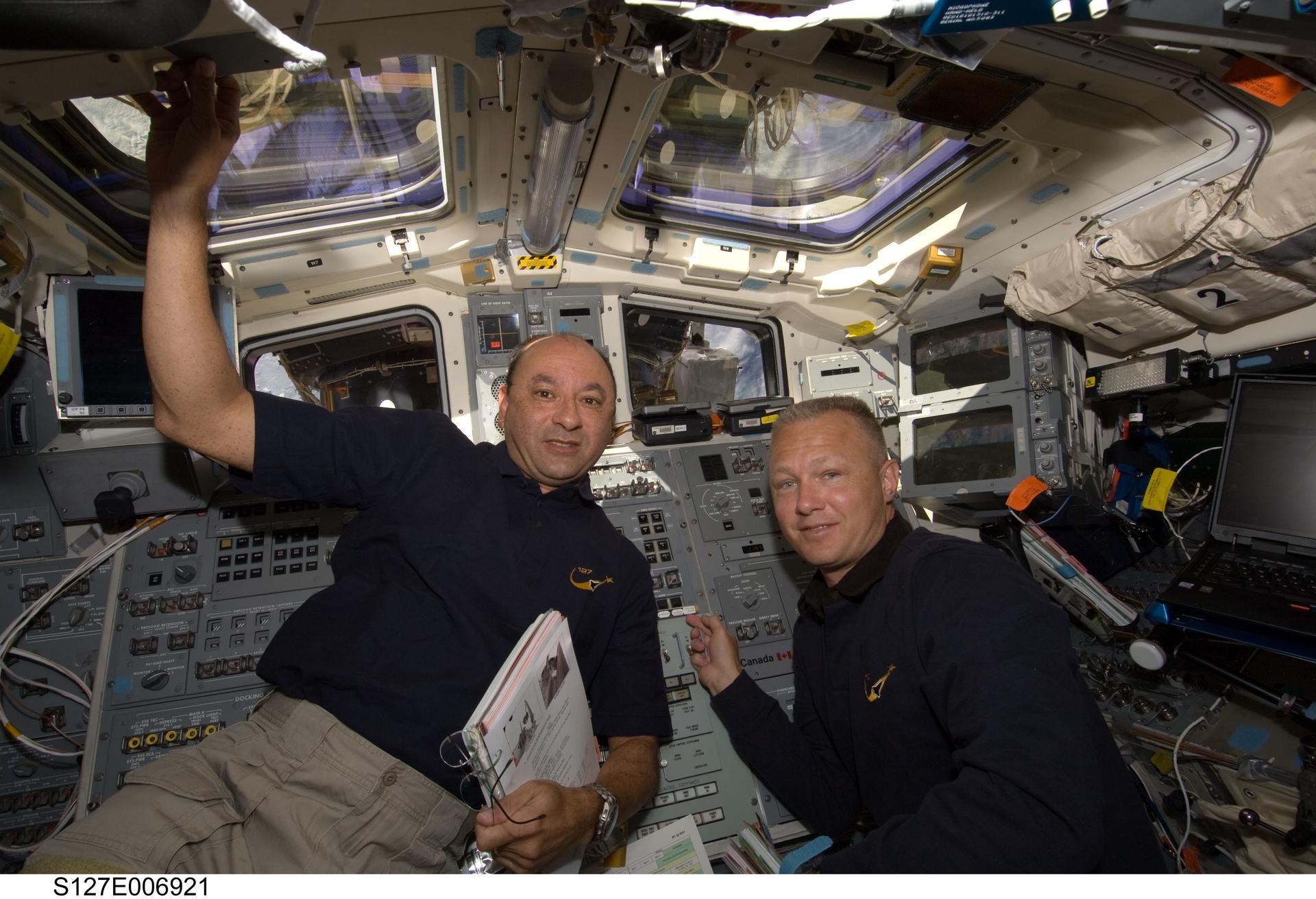 S127-E-006921 (19 July 2009) --- Astronauts Mark Polansky (left), commander, and Doug Hurley, pilot, are pictured at Endeavour's aft flight deck controls during flight day five operations with hardware on the International Space Station. The hardware moves will enable the second pair of spacewalkers--mission specialists Dave Wolf and Tom Marshburn--to perform its spacewalk assignment on July 20.