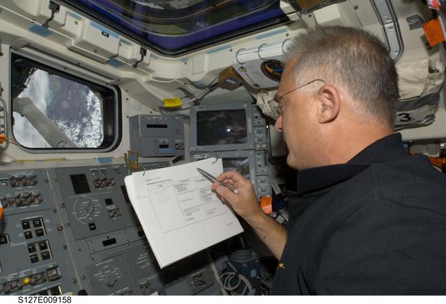 S127-E-009158 (27 July 2009) --- Astronaut Dave Wolf, STS-127 mission specialist, looks over a checklist on the aft flight deck of Space Shuttle Endeavour while docked with the International Space Station.