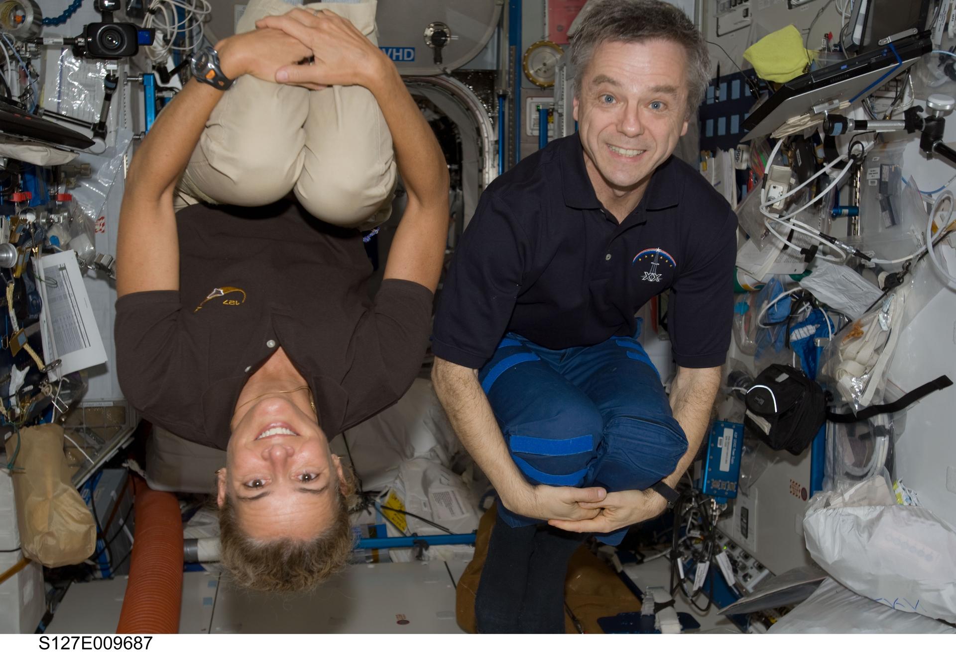 S127-E-009687 (28 July 2009) --- Canadian Space Agency astronauts Julie Payette, STS-127 mission specialist; and Robert Thirsk, Expedition 20 flight engineer, pose for a photo in the Destiny laboratory of the International Space Station while Space Shuttle Endeavour remains docked with the station.