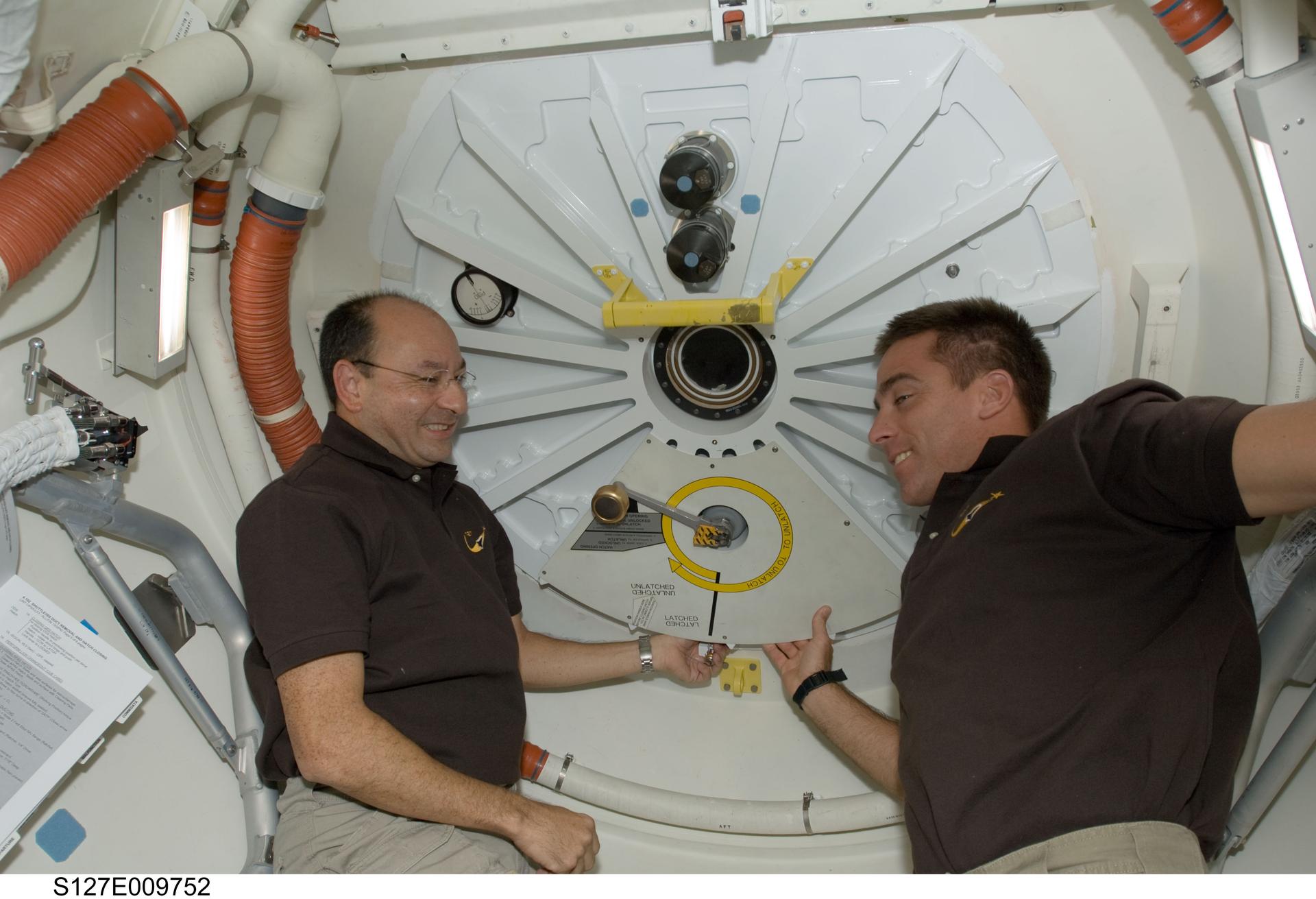 S127-E-009752 (28 July 2009) --- Astronauts Mark Polansky (left), STS-127 commander; and Christopher Cassidy, mission specialist, close the hatch on the middeck of Space Shuttle Endeavour prior to undocking from the International Space Station to conclude 11 days of cooperative work onboard the shuttle and the station. Undocking of the two spacecraft occurred at 12:26 p.m. (CDT) on July 28, 2009.
