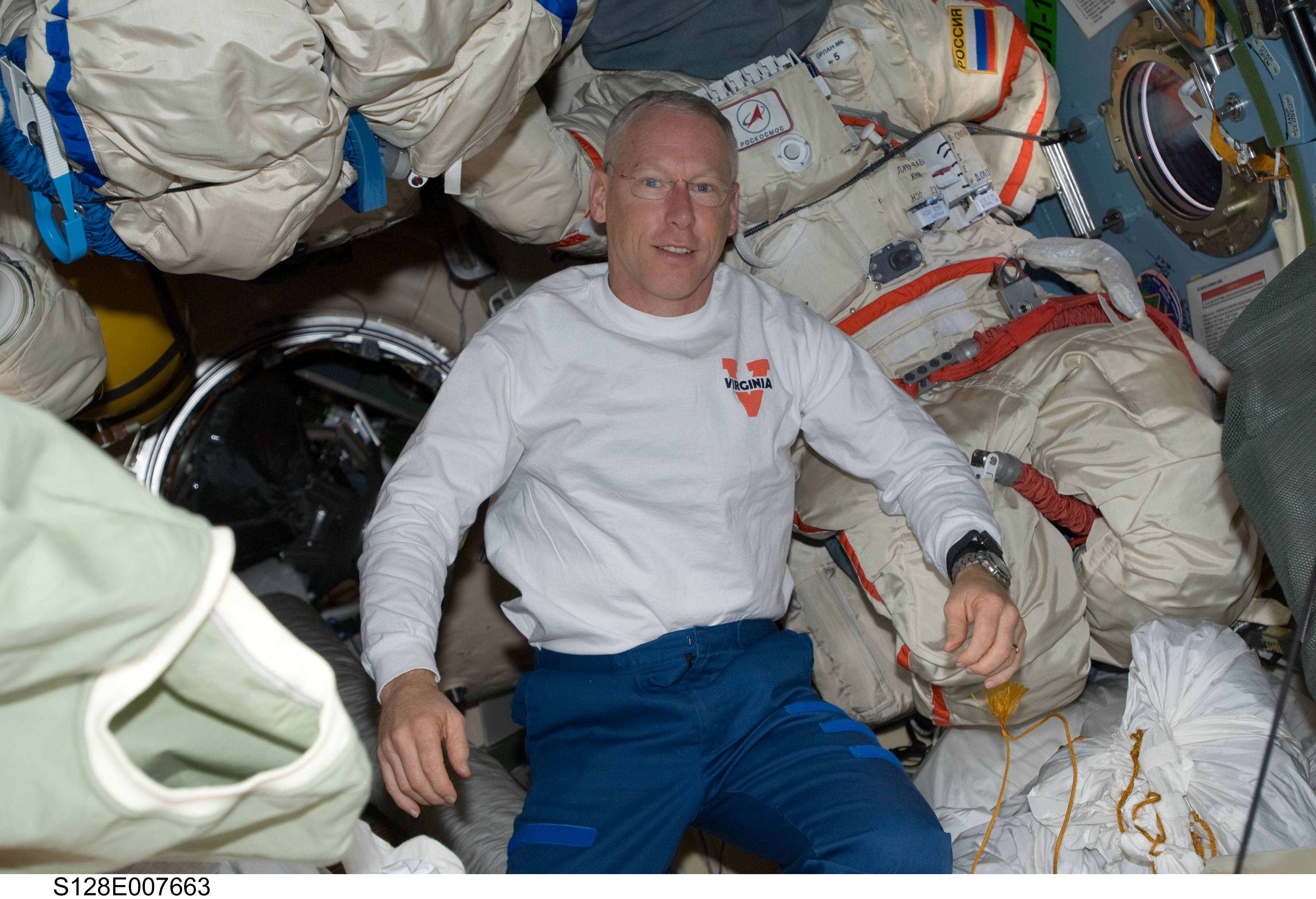 S128-E-007663 (5 Sept. 2009) --- NASA astronaut Patrick Forrester, STS-128 mission specialist, is pictured in the Pirs Docking Compartment of the International Space Station while Space Shuttle Discovery remains docked with the station.