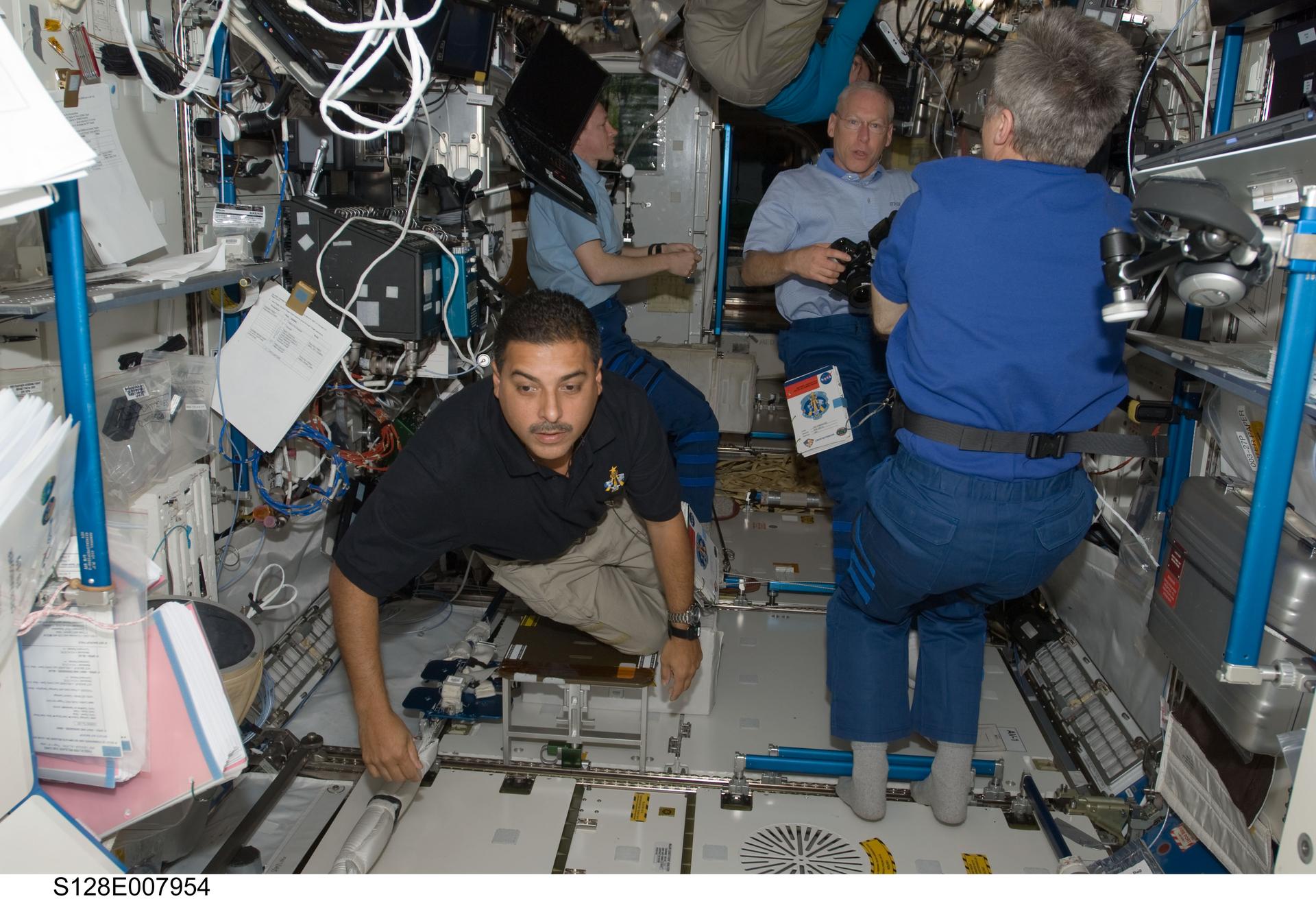 S128-E-007954 (7 Sept. 2009) --- NASA astronauts Jose Hernandez (left foreground) and Patrick Forrester (right background), both STS-128 mission specialists; and Michael Barratt (top center), Expedition 20 flight engineer; along with European Space Agency astronaut Frank De Winne (left background) and Canadian Space Agency astronaut Robert Thirsk, both Expedition 20 flight engineers, are busy with various tasks in the Destiny laboratory of the International Space Station.