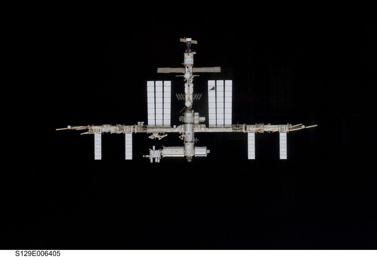 S129-E-006405 (18 Nov. 2009) --- Backdropped by the blackness of space, the International Space Station is featured in this image photographed by an STS-129 crew member as Space Shuttle Atlantis and the station approach each other during rendezvous and docking activities on flight day three. Docking occurred at 10:51 a.m. (CST) on Nov. 18, 2009.