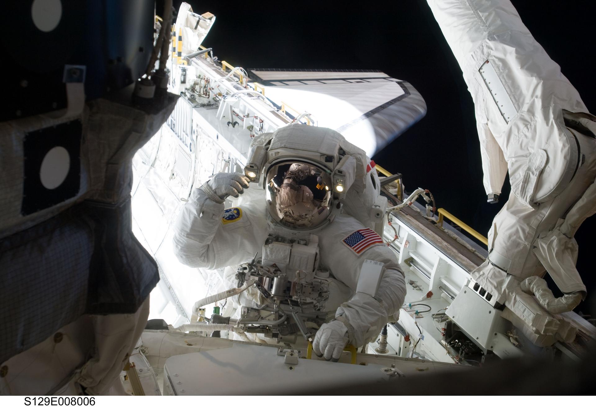 S129-E-008006 (23 Nov. 2009) --- Astronaut Randy Bresnik, STS-129 mission specialist, participates in the mission's third and final session of extravehicular activity (EVA) as construction and maintenance continue on the International Space Station. During the five-hour, 42-minute spacewalk, Bresnik and astronaut Robert L. Satcher Jr. (out of frame), mission specialist, removed a pair of micrometeoroid and orbital debris shields from the Quest airlock and strapped them to the External Stowage Platform #2, then moved an articulating foot restraint to the airlock, and released a bolt on a starboard truss ammonia tank assembly (ATA) in preparation for an STS-131 spacewalk that will replace the ATA.