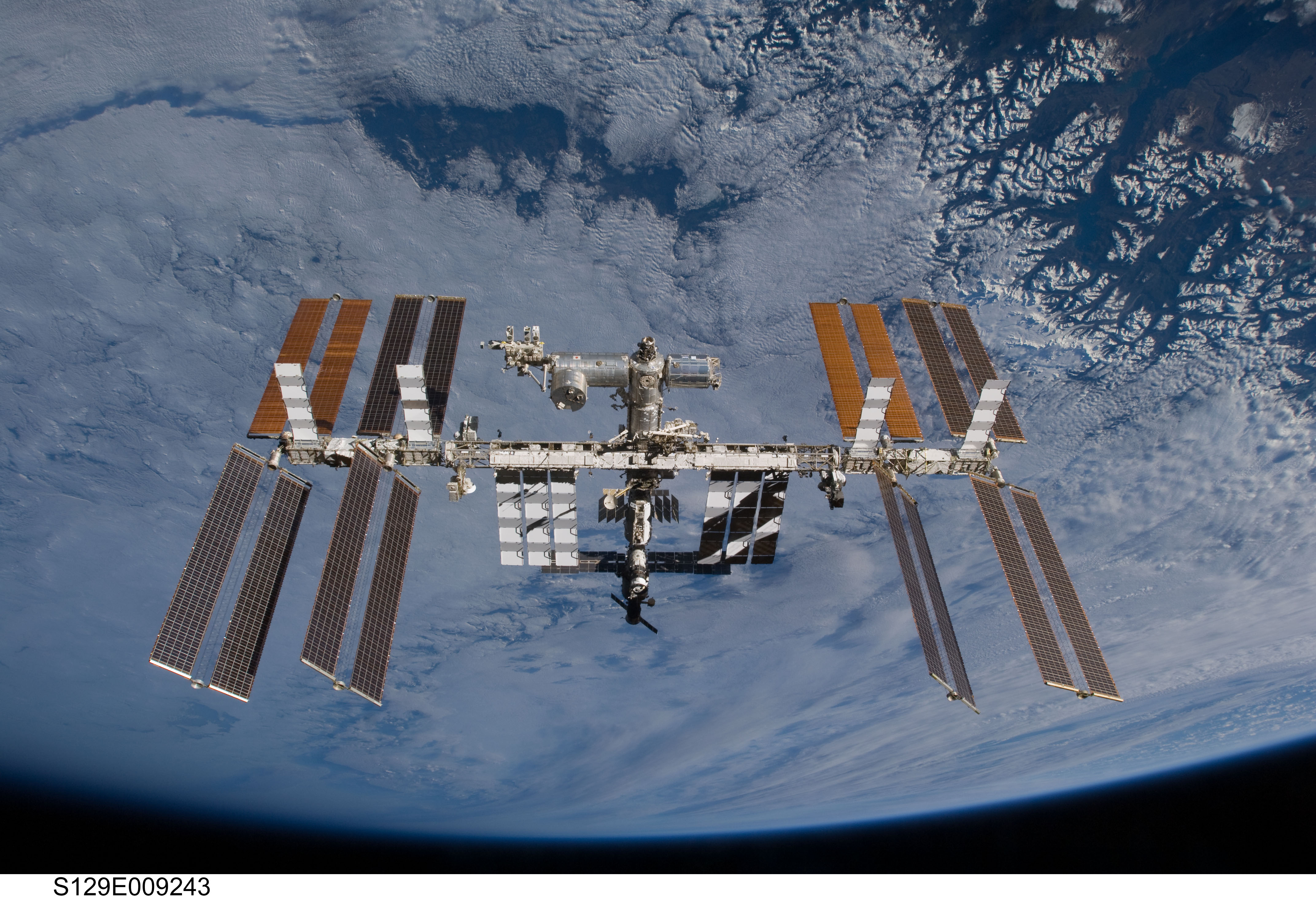 S129-E-009243 (25 Nov. 2009) --- Set against the background of a cloud covered Earth, the International Space Station is featured in this image photographed by an STS-129 crew member on Atlantis soon after the station and shuttle began their post-undocking relative separation. Undocking of the two spacecraft occurred at 3:53 a.m. (CST) on Nov. 25, 2009.