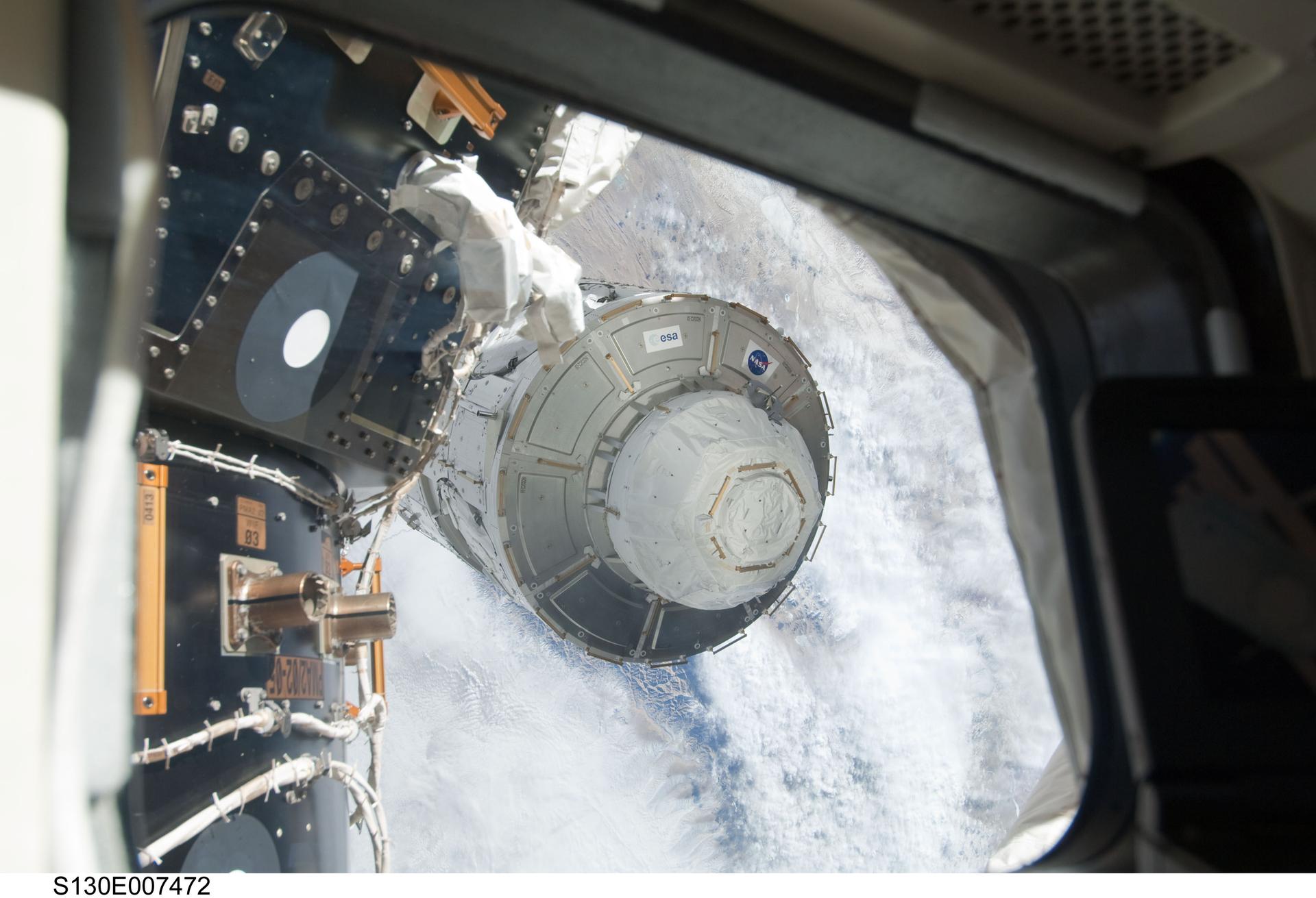 S130-E-007472 (11 Feb. 2010) --- In the grasp of the station’s Canadarm2, the Tranquility module is transferred from its stowage position in space shuttle Endeavour’s (STS-130) payload bay to position it on the port side of the Unity node of the International Space Station. Tranquility was locked in place with 16 remotely-controlled bolts.