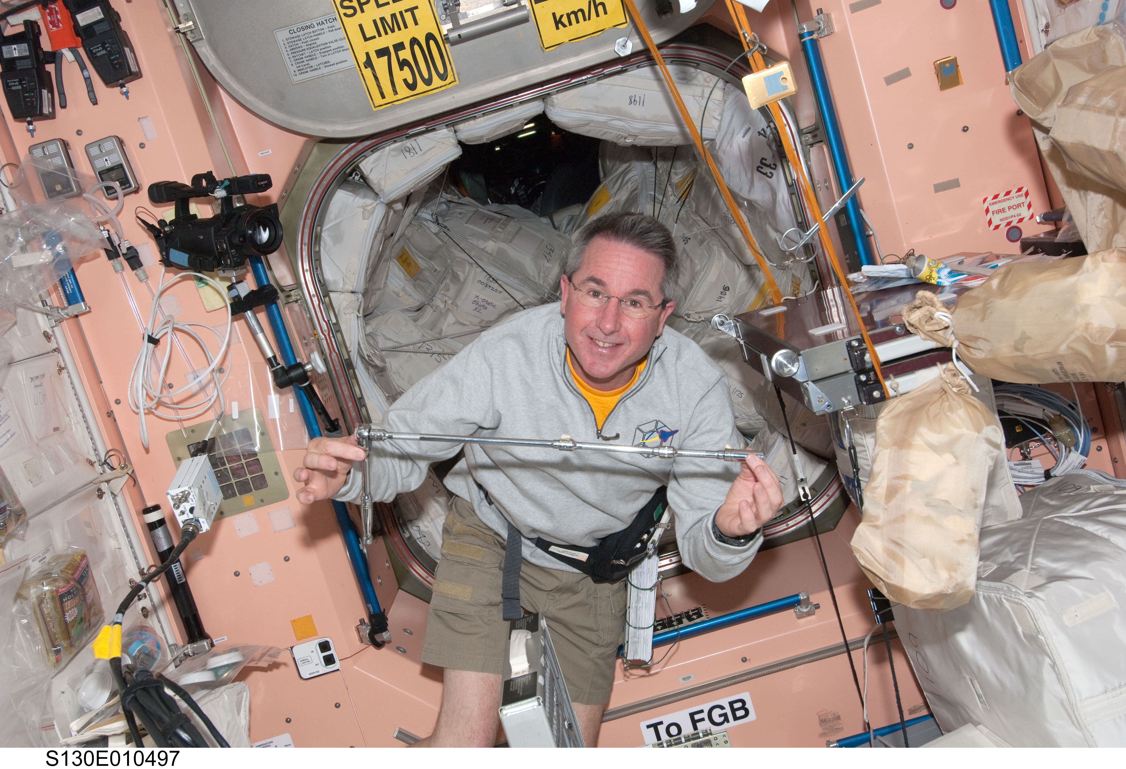 S130-E-010497 (18 Feb. 2010) --- NASA astronaut Stephen Robinson, STS-130 mission specialist, holds a tool in the Unity node of the International Space Station while space shuttle Endeavour remains docked with the station.