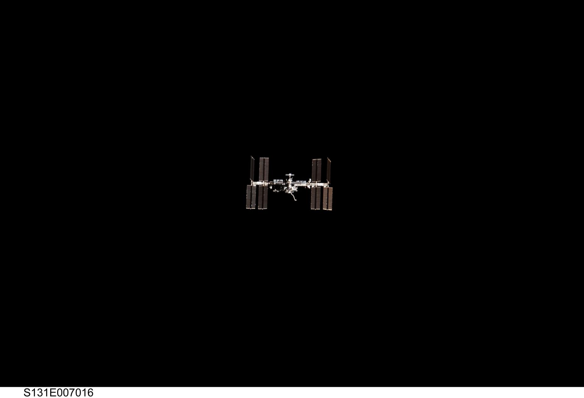 S131-E-007016 (7 April 2010) --- Surrounded by the blackness of space, the International Space Station appears to be very small from the point of view of space shuttle Discovery as the shuttle approaches the station during STS-131 rendezvous and docking operations. Docking occurred at 2:44 a.m. (CDT) on April 7, 2010.