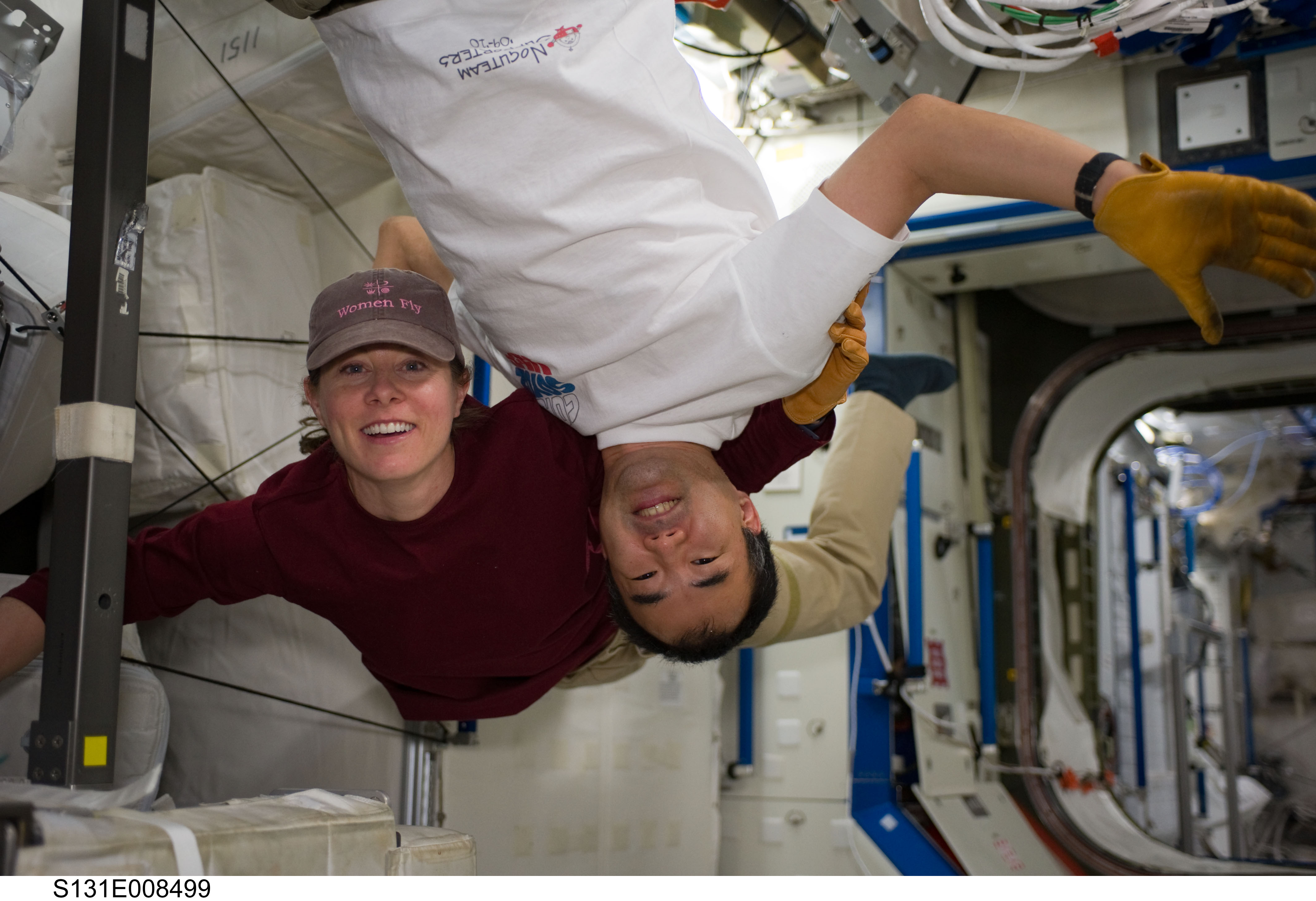 S131-E-008499 (10 April 2010) --- NASA astronaut Tracy Caldwell Dyson and Japan Aerospace Exploration Agency (JAXA) astronaut Soichi Noguchi, both Expedition 23 flight engineers, pose for a photo in the Destiny laboratory of the International Space Station while space shuttle Discovery (STS-131) remains docked with the station.
