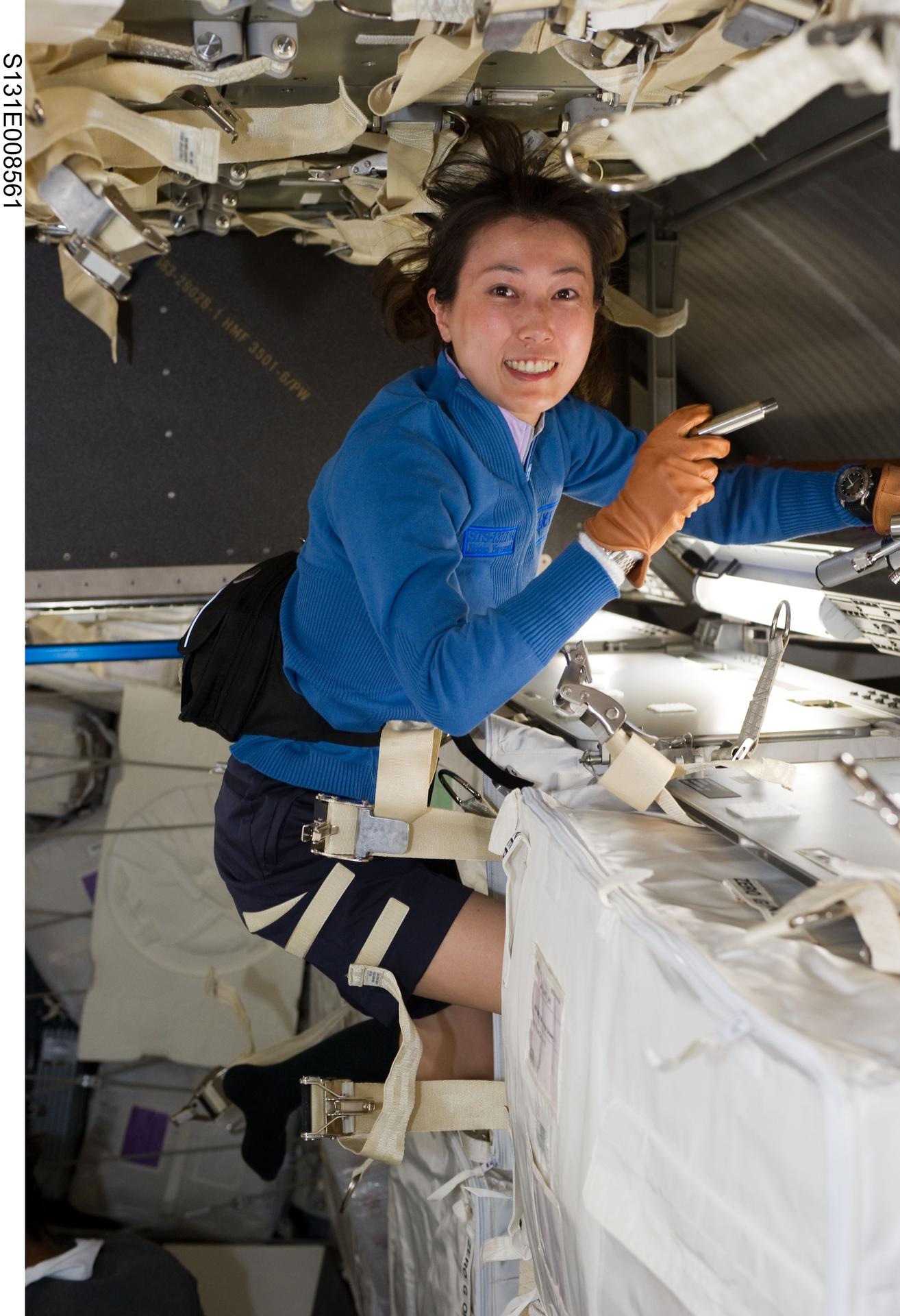 S131-E-008561 (10 April 2010) --- Japan Aerospace Exploration Agency (JAXA) astronaut Naoko Yamazaki, STS-131 mission specialist, works in the Leonardo Multi-Purpose Logistics Module (MPLM) linked to the International Space Station while space shuttle Discovery remains docked with the station.
