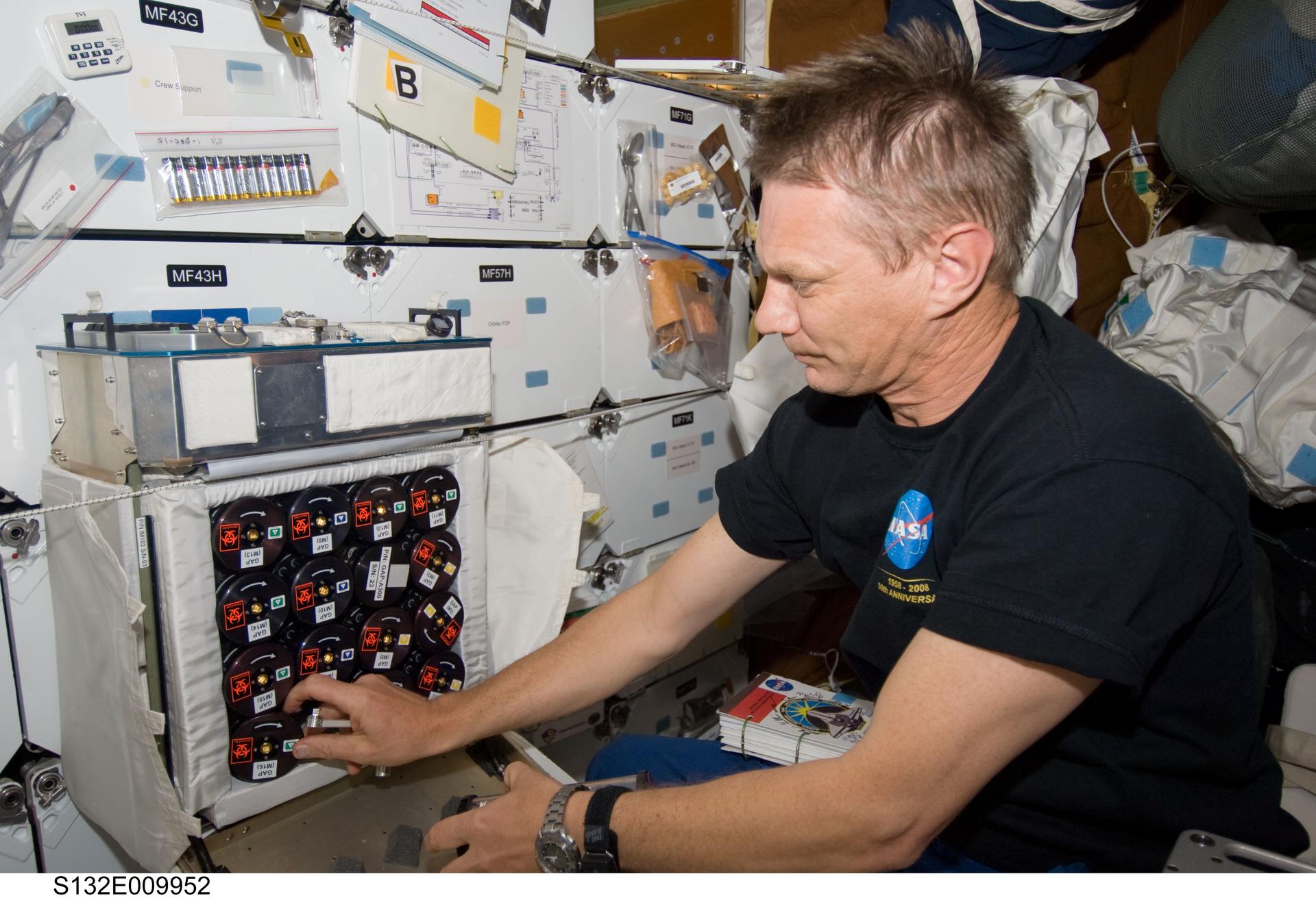 S132-E-009952 (22 May 2010) --- NASA astronaut Piers Sellers, STS-132 mission specialist, works with Group Activation Packs (GAP) on the middeck of space shuttle Atlantis while docked with the International Space Station.