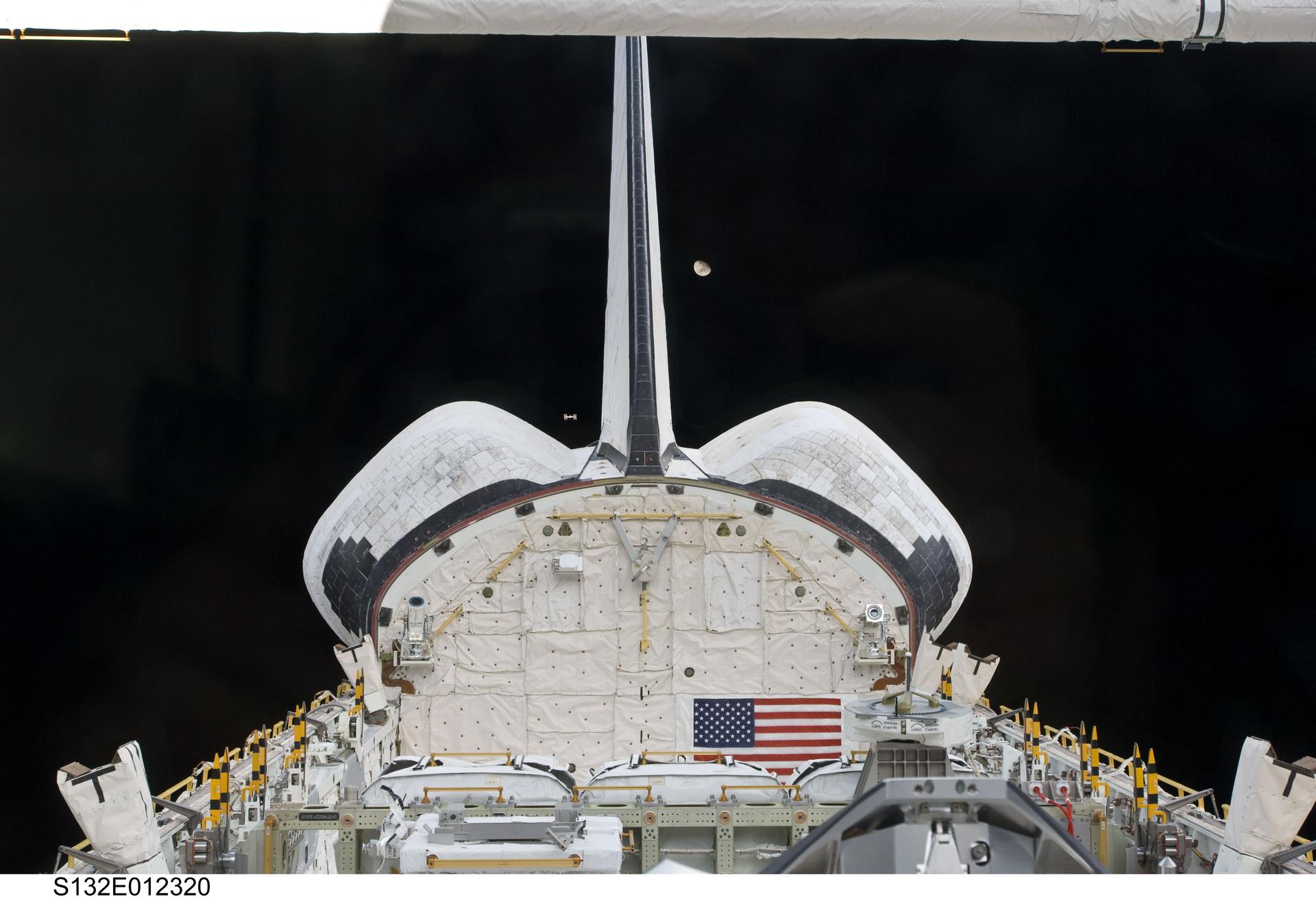 S132-E-012320 (23 May 2010) --- Space shuttle Atlantis? vertical stabilizer, orbital maneuvering system (OMS) pods and payload bay; along with the distant International Space Station and moon are featured in this image photographed by an STS-132 crew member onboard the shuttle. The space station appears very small from the point of view of the Atlantis as the two spacecraft carry out their relative separation. Undocking of the two spacecraft occurred at 10:22 a.m. (CDT) on May 23, 2010.