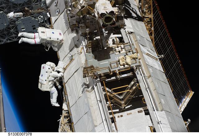 S133-E-007378 (28 Feb. 2011) --- NASA astronauts Steve Bowen and Alvin Drew, both STS-133 mission specialists, participate in the mission?s first session of extravehicular activity (EVA) as construction and maintenance continue on the International Space Station. During the six-hour, 34-minute spacewalk, Bowen and Drew installed the J612 power extension cable, move a failed ammonia pump module to the External Stowage Platform 2 on the Quest Airlock for return to Earth at a later date, installed a camera wedge on the right hand truss segment, installed extensions to the mobile transporter rail and exposed the Japanese ?Message in a Bottle? experiment to space. Photo credit: NASA or National Aeronautics and Space Administration
