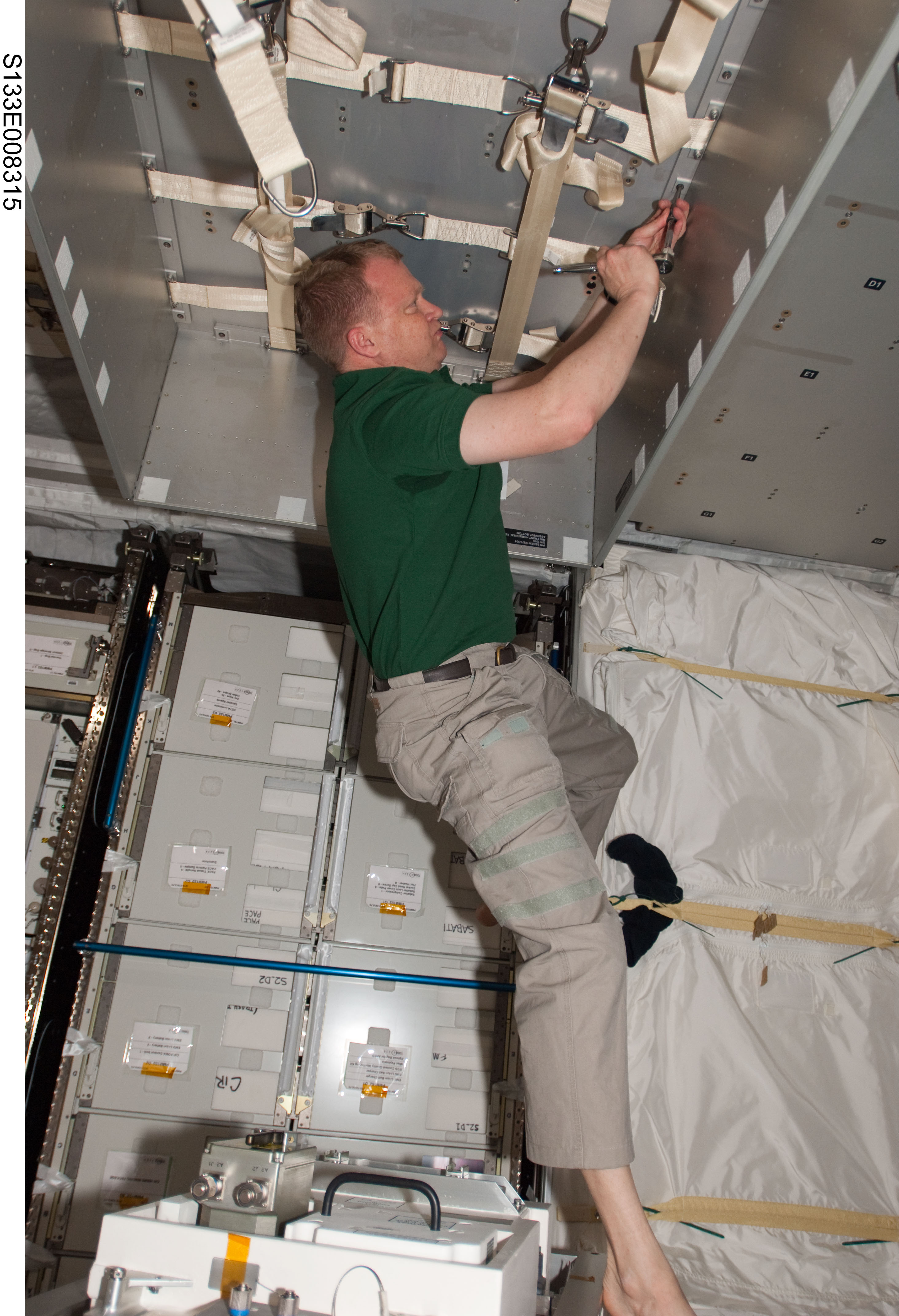 S133-E-008315 (2 March 2011) --- NASA astronaut Eric Boe, STS-133 pilot, works in the newly-installed Permanent Multipurpose Module (PMM) of the International Space Station while space shuttle Discovery remains docked with the station. Photo credit: NASA or National Aeronautics and Space Administration