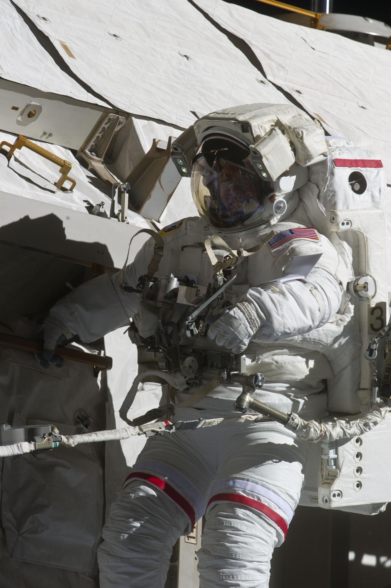 S134-E-009119 (25 May 2011) --- With various components of the International Space Station in the view, NASA astronaut Andrew Feustel is pictured during the STS-134 mission?s third spacewalk (Feustel?s third for the mission and sixth overall in his career). Astronauts Feustel and Michael Fincke (out of frame), both mission specialists, coordinated their shared activity with NASA astronaut Greg Chamitoff (out of frame), who stayed in communication with the pair and with Mission Control Center in Houston from the shirt sleeve environment inside the ISS. Photo credit: NASA