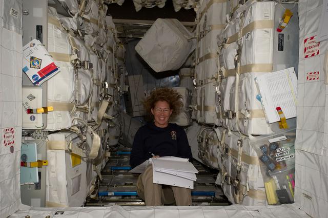 S135-E-007478 (12 July 2011) --- Surrounded by supplies and spare parts in the Raffaello multi-purpose logistics module, NASA astronaut Sandy Magnus continues her role as "load master" for the joint activities of the Atlantis and International Space Station crews. The tons of items are for use and consumption for the station and its crews. Raffaello was transported up to the station by Magnus and her three crewmates aboard the space shuttle. Photo credit: NASA