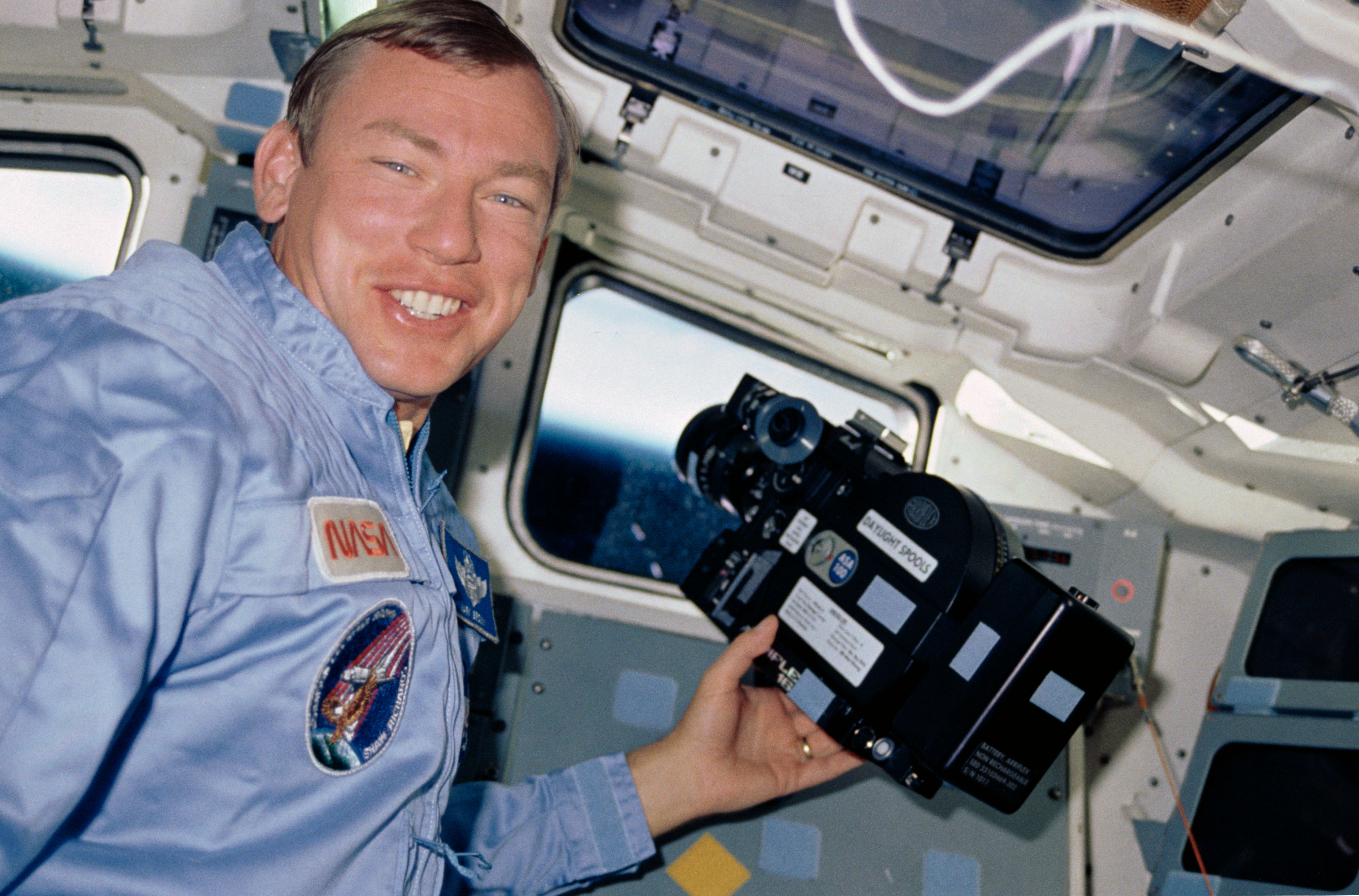 STS028-17-033 (August 1989) --- Astronaut Mark N. Brown, STS-28 mission specialist, pauses from a session of motion-picture photography conducted through one of the aft windows on the flight deck of the Earth-orbiting Space Shuttle Columbia. He is using an Arriflex camera. The horizon of the blue and white appearing Earth and its airglow are visible in the background.
