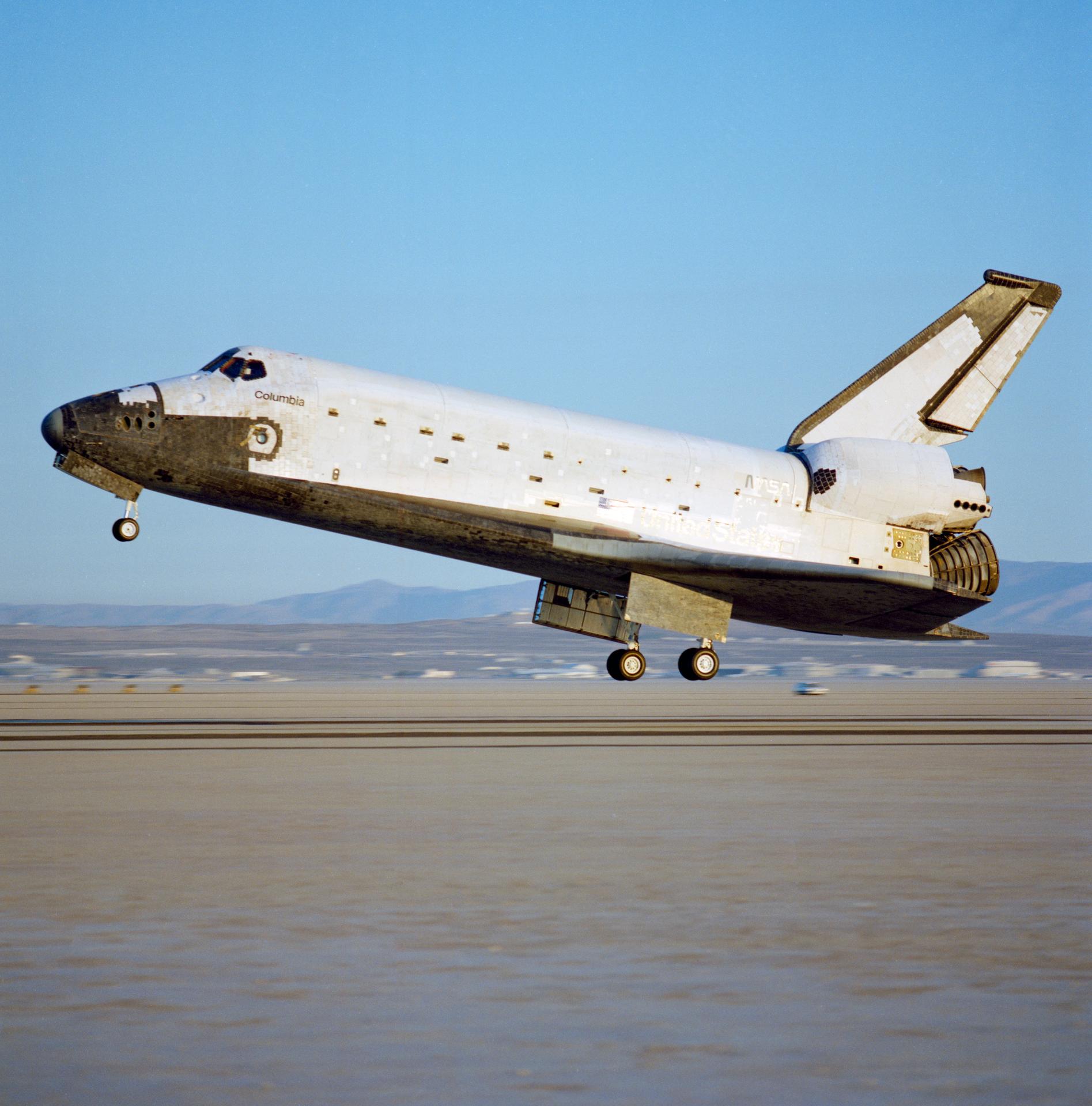 STS028-S-018 (13 Aug 1989) --- The Space shuttle Columbia is captured on film just prior to main gear touchdown at Edwards Air Force Base in Southern California. The landing marked a successful end to a five-day Department of Defense (DOD)-devoted mission. Onboard the spacecraft were astronauts Brewster H. Shaw Jr., Richard N. Richards, David C. Leestma, James C. Adamson and Mark N. Brown.