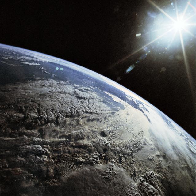 STS031-83-090 (24-29 April 1990) --- This late afternoon scene over the Andes Mountains features sun glare, heavy cloud illumination and sunglint against the Pacific Ocean. This photo was among those selected by the crew members for showing at their May 9, 1990, Post-Flight Press Conference (PFPC) at the Johnson Space Center (JSC) Public Affairs Office (PAO) Facility briefing room. Onboard the Space Shuttle Discovery for the flight, which lifted off on April 24, 1990, and landed on April 29, 1990, were astronauts Loren J. Shriver, Charles F. Bolden, Jr., Bruce McCandless II, Kathryn D. Sullivan and Steven A. Hawley. Some of the slides were not actually shown due to a shortage of time.