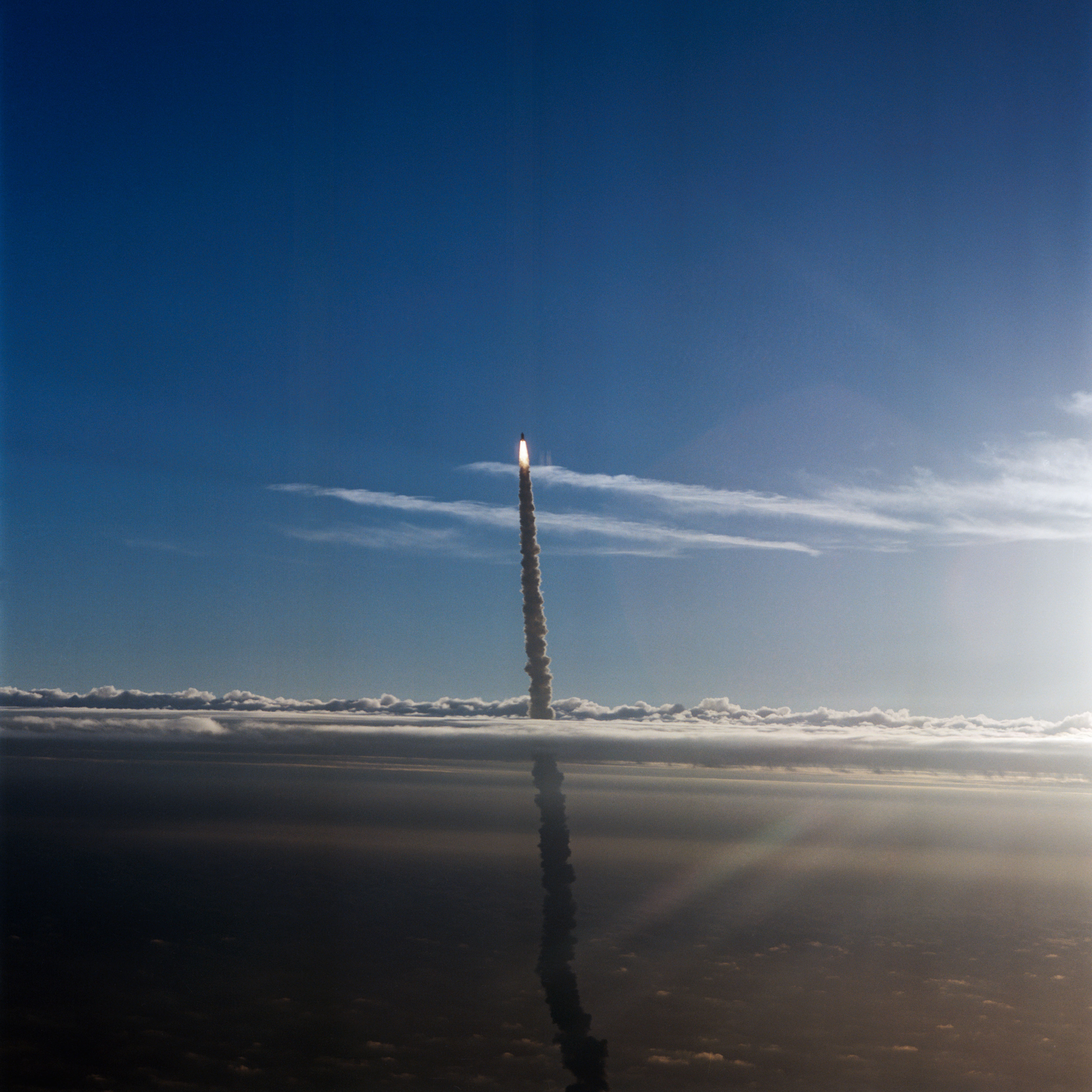 STS-32 Columbia, Orbiter Vehicle (OV) 102, pierces a layer of low lying clouds as it makes its ascent to Earth orbit for a 10-day mission. In this air-to-air view, OV-102 rides atop the external tank (ET) with flames created by solid rocket boosters (SRBs) appearing directly underneath it and a long plume of exhaust smoke trailing behind it and extending to Kennedy Space Center (KSC) Launch Complex (LC) Pad 39A below. OV-102 left KSC LC Pad 39A at 7:34:59:98 am Eastern Standard Time (EST) some 24 hours after dubious weather at the return-to-landing site (RTLS) had cancelled a scheduled launch. The photo was taken by astronaut Michael L. Coats, acting chief of the Astronaut Office, from the Shuttle Training Aircraft (STA).