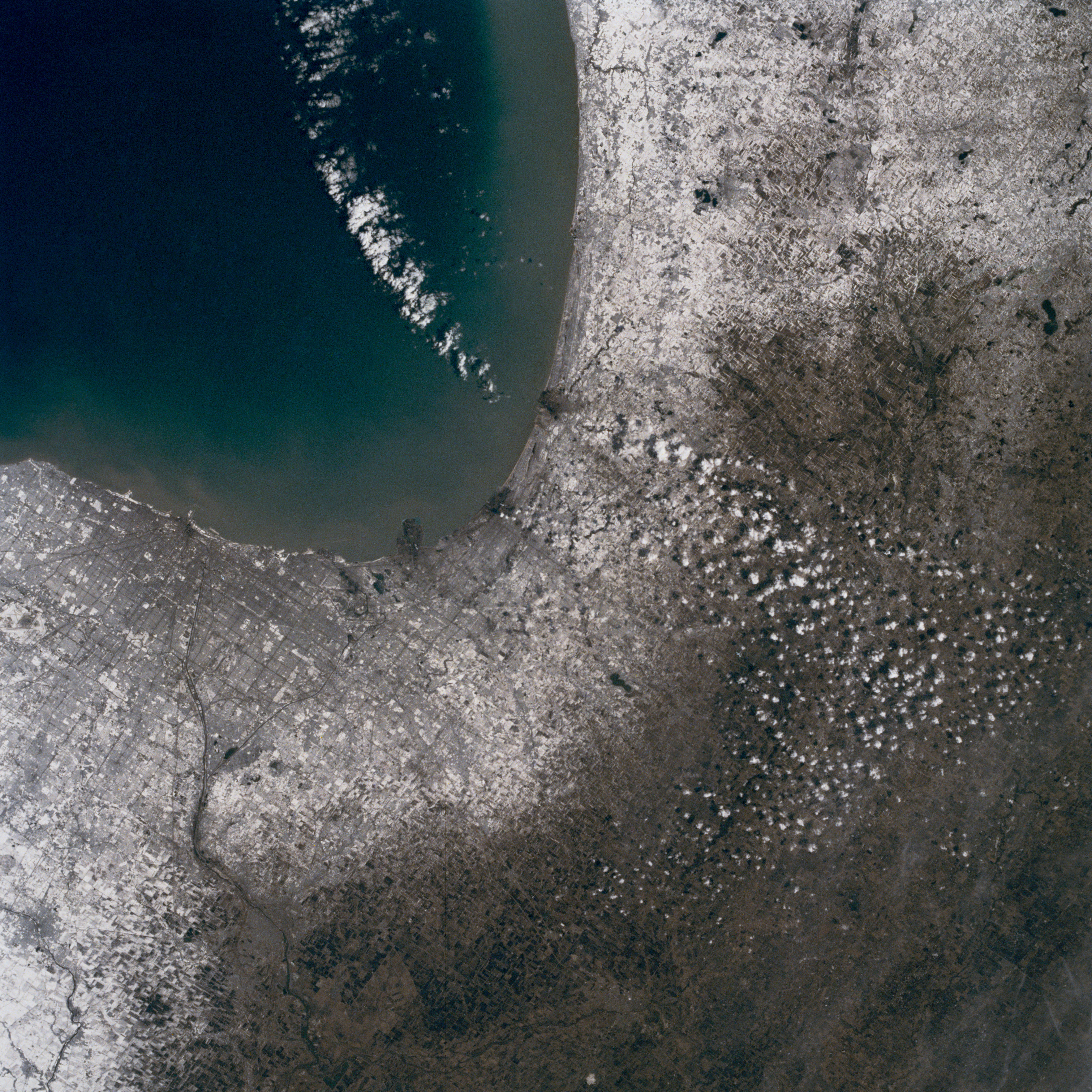 In this late winter scene of Chicago, Illinois, USA (41.5N, 87.0W) the light dusting of snow has actually enhanced the determination of the cities street pattern, parks and other cultural features. Sited at the south end of Lake Michigan, Chicago has long served as an industrial, transportation and communications center for the midwest. The obvious snowline on the ground enables meteorologists to trace the regional groundtracks of winter storms.