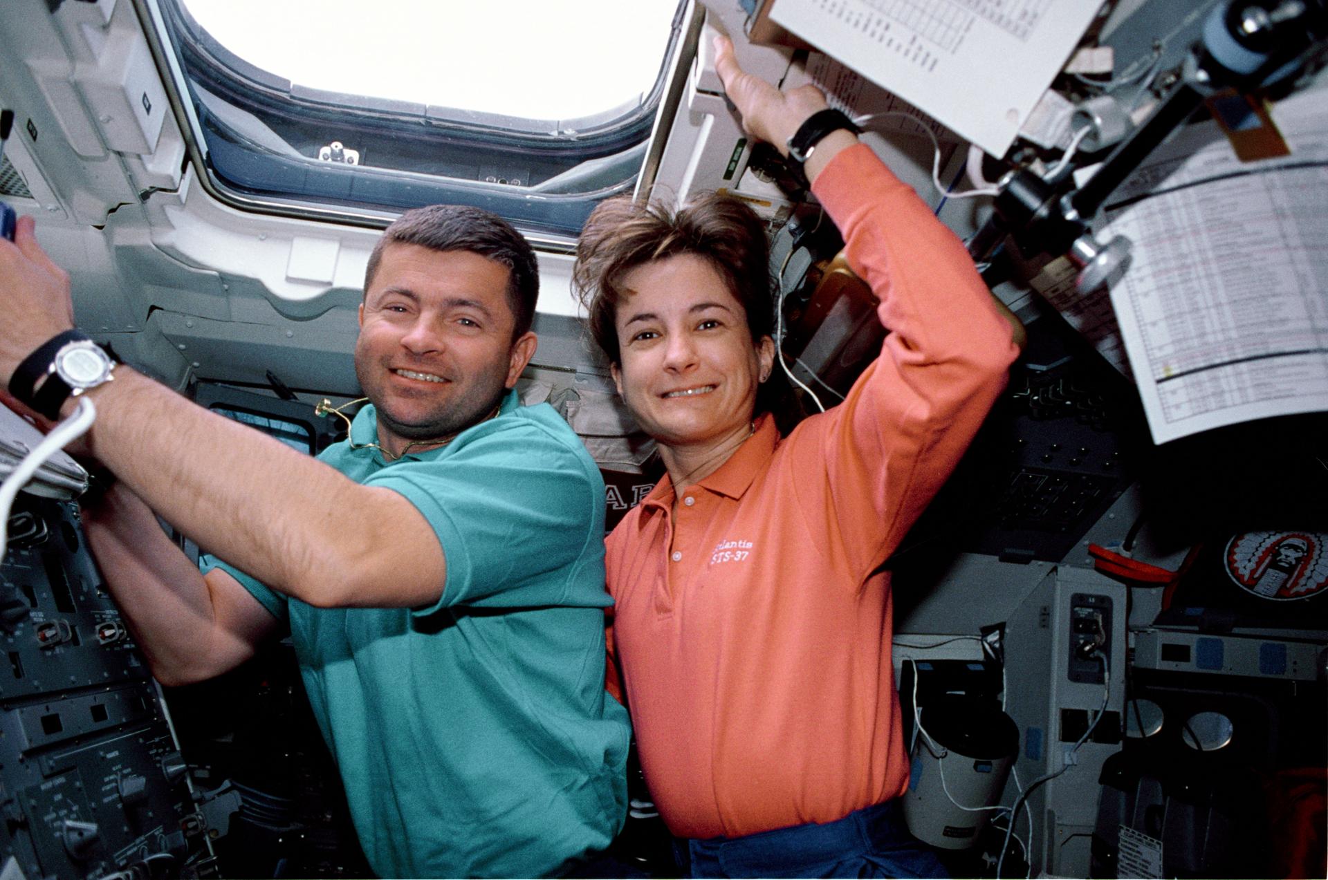 STS037-33-031 (5-11 April 1991) --- Astronauts Kenneth D. Cameron, STS-37 pilot, and Linda M. Godwin, mission specialist, take advantage of a well-lighted crew cabin to pose for an in-space portrait on the Space Shuttle Atlantis' aft flight deck. The two shared duties controlling the Remote Manipulator System (RMS) during operations involving the release of the Gamma Ray Observatory (GRO) and the Extravehicular Activity (EVA) of astronauts Jerry L. Ross and Jerome (Jay) Apt. The overhead window seen here and nearby eye-level windows (out of frame at left) are in a busy location on Shuttle missions, as they are used for payload surveys, Earth observation operations, astronomical studies and other purposes. Note the temporarily stowed large format still photo camera at lower right corner. This photo was made with a 35mm camera. This was one of the visuals used by the crew members during their April 19 Post Flight Press Conference (PFPC) at the Johnson Space Center (JSC).