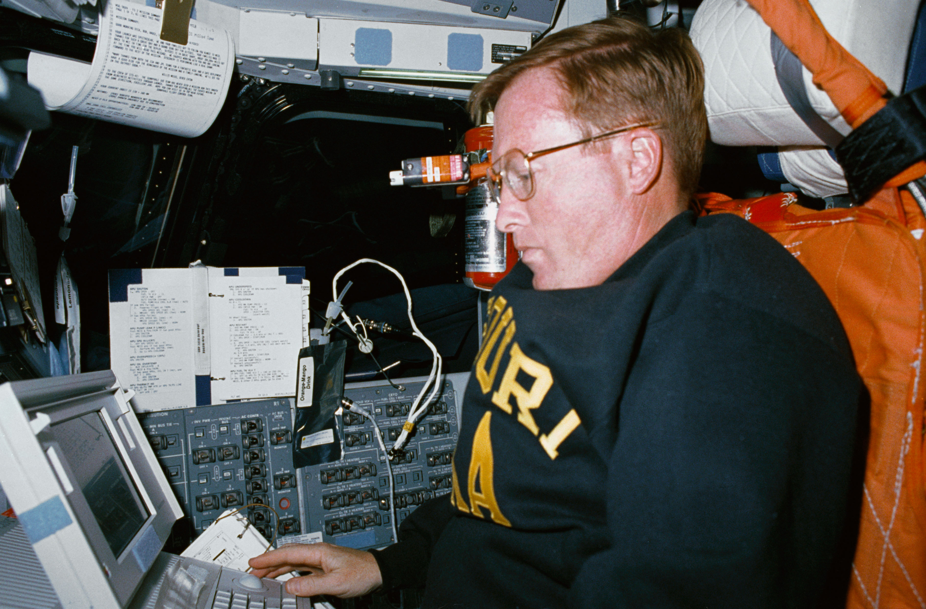 STS041-01-002 (6-10 Oct 1990) --- Astronaut Richard N. Richards, STS 41 mission commander, "borrows" the pilot's station to utilize a Shuttle portable onboard computer during the four-day flight. The photo was made with a 35mm camera.