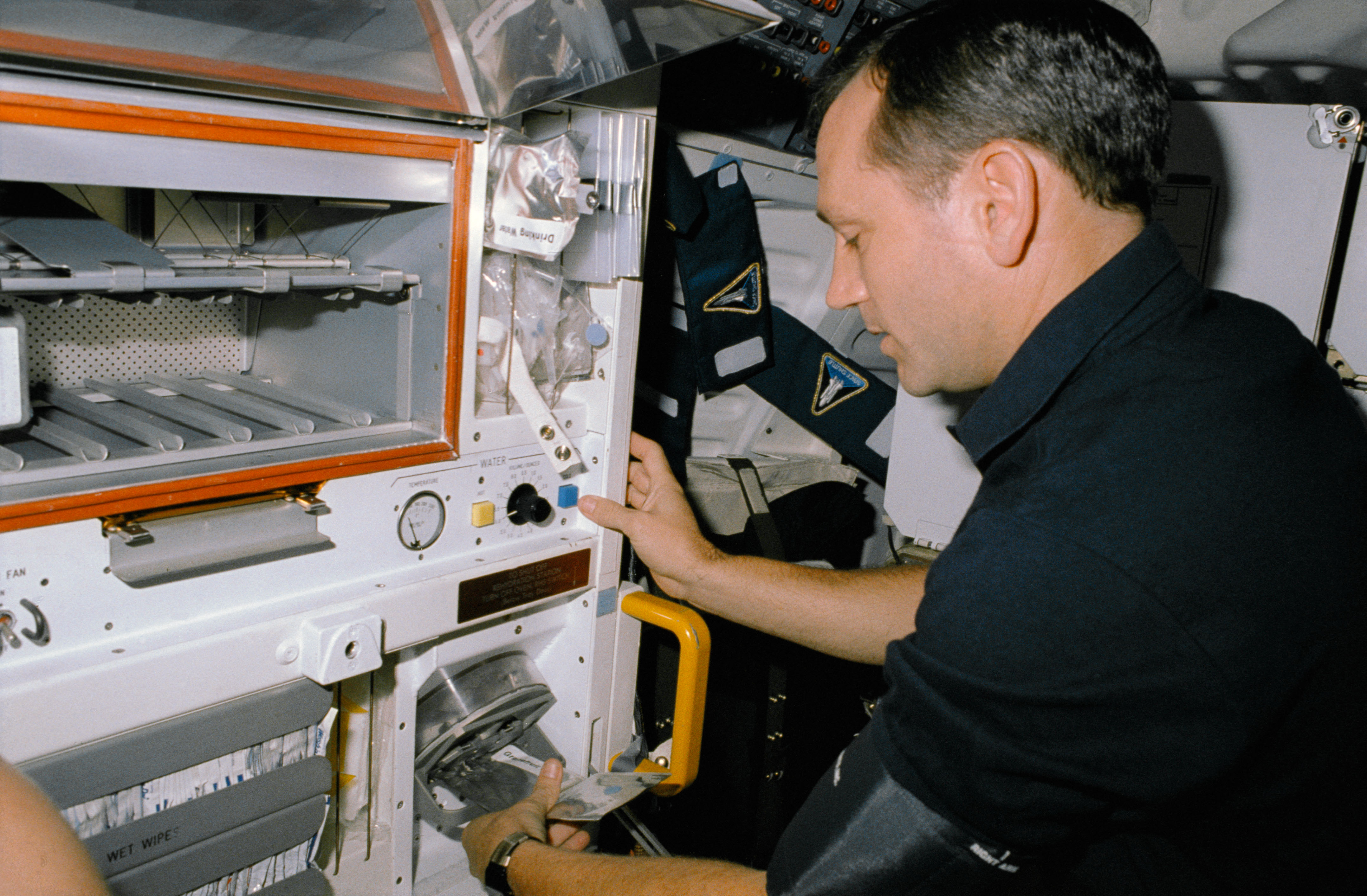 STS041-06-004 (6-10 Oct 1990) --- A 35mm scene of astronaut Thomas D. Akers, STS-41 mission specialist, using Space Shuttle Discovery?s galley water feed to rehydrate a package of food.