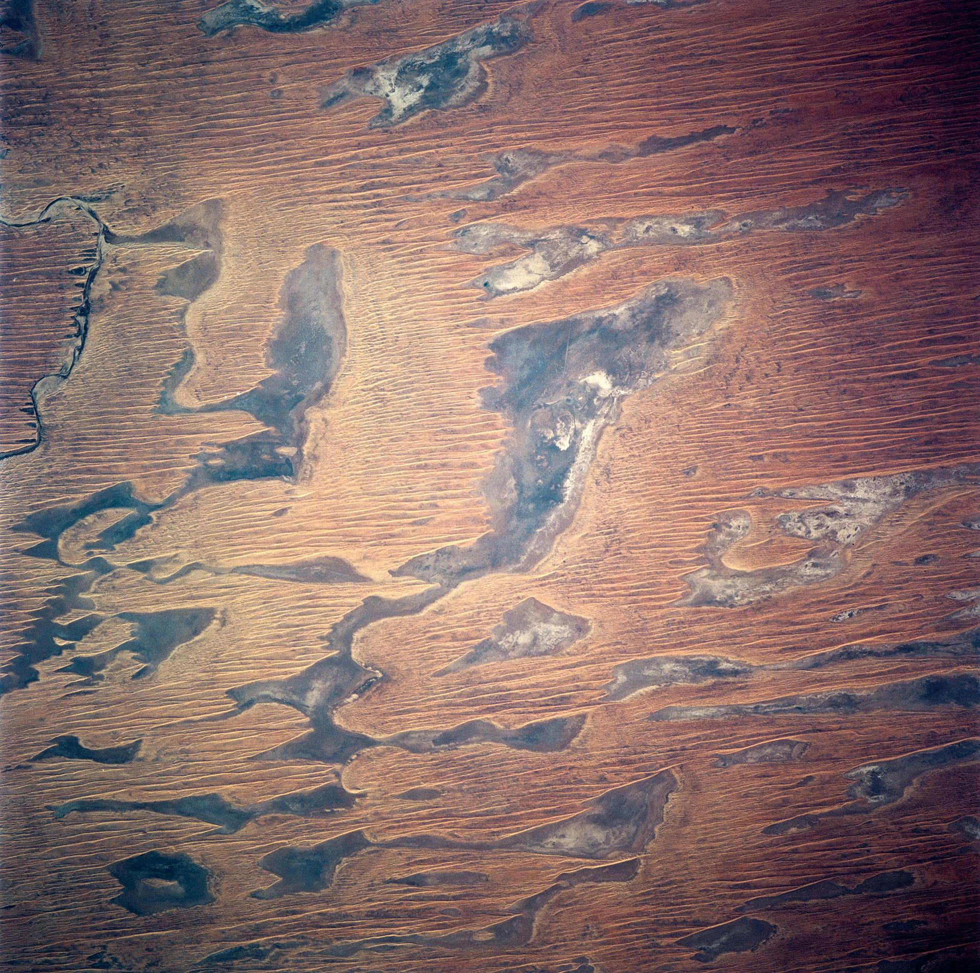 This image of abstract shapes is comprised numerous subparallel, very long, orange colored linear dunes and patchy grey dry lakes (playas). The dunes are aligned north to south in the great central basin of Astralia (27.0S, 138.0E). The regularity of the dunes is created by the winds blowing from the south. As the dunes advance, jaged edges on the south side of each dry lake are formed while the north side is eroded smooth by the wind and water.