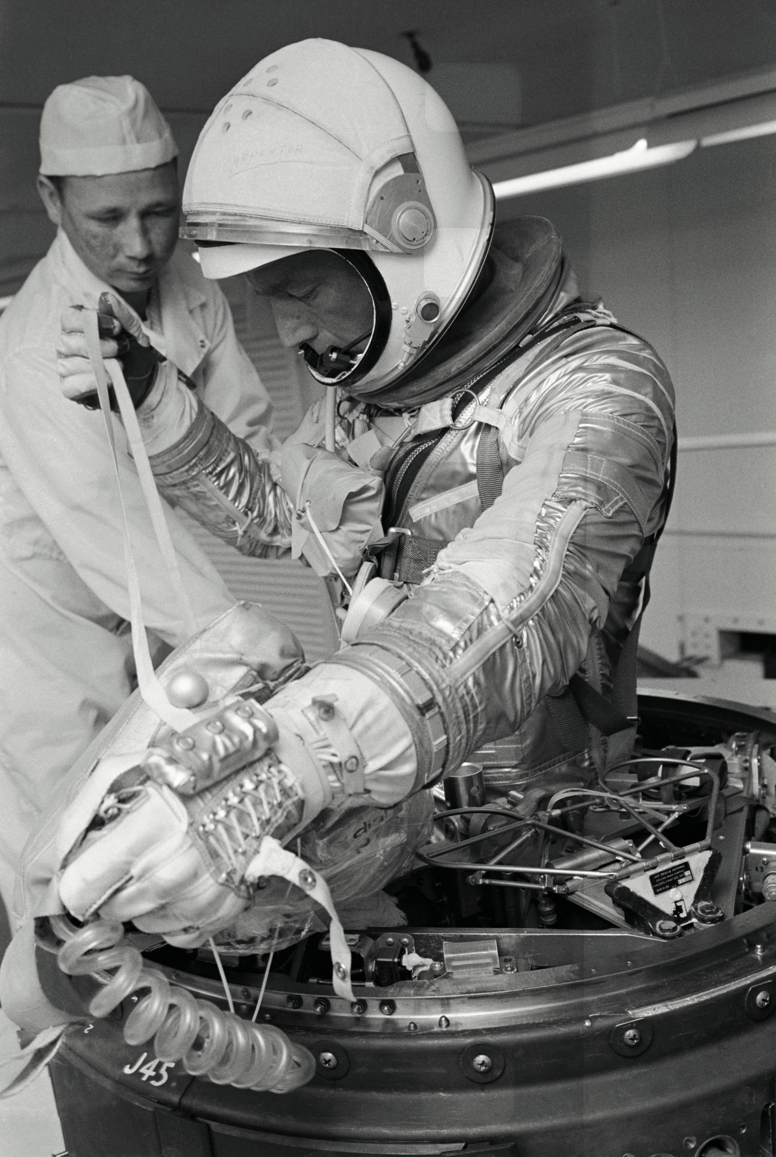 Astronaut Virgil Grissom in new Mercury Space Suit during egress training
