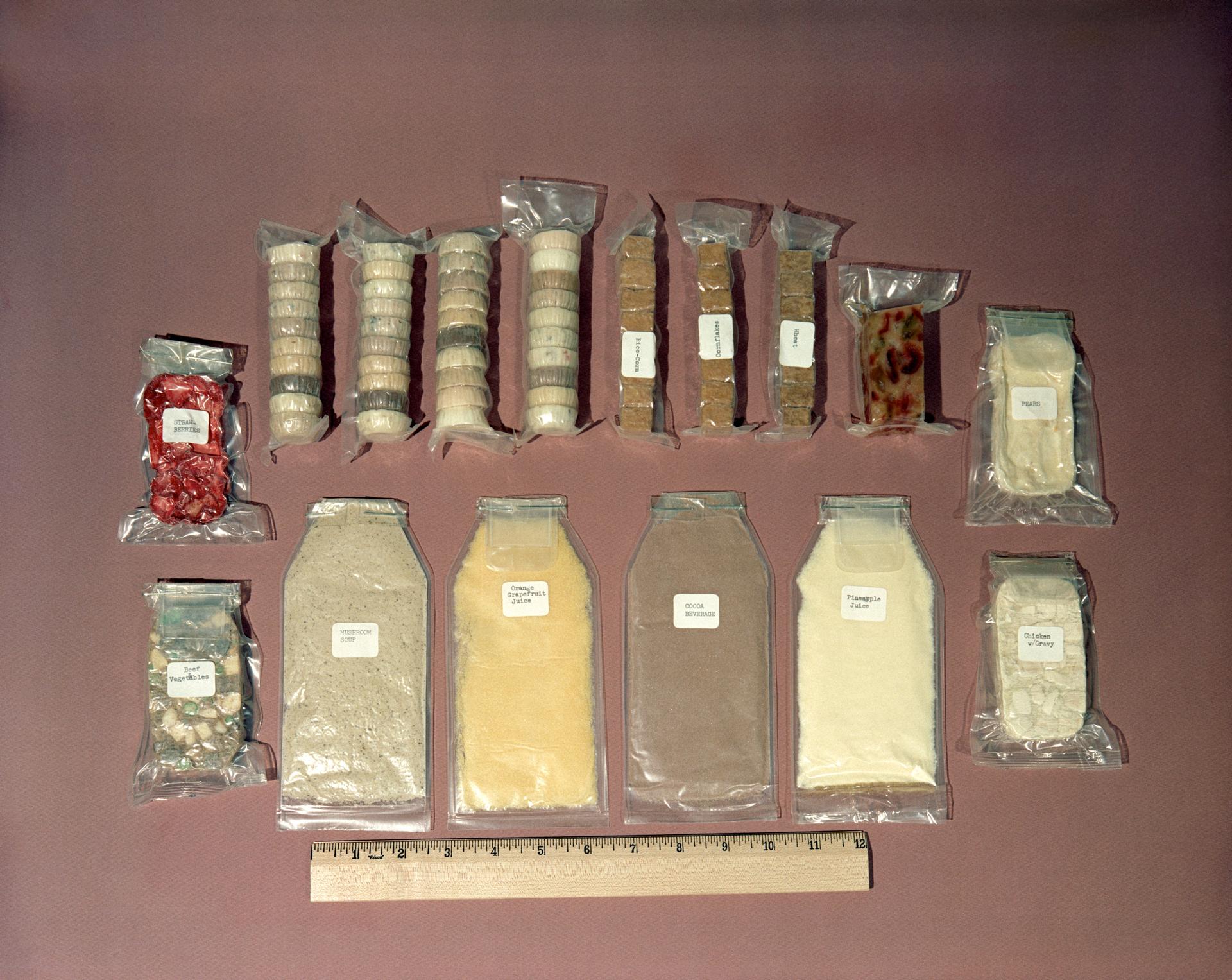 S62-08742 (1962) --- Food kit used by Mercury astronauts. Some is dehydrated and needs water, other packets are ready to eat. Size is measured relative to a ruler. Included are packets of mushroom soup, orange-grapefruit juice, cocoa beverage, pineapple juice, chicken with gravy, pears, strawberries, beef and vegetables and other assorted food containers. Photo credit: NASA