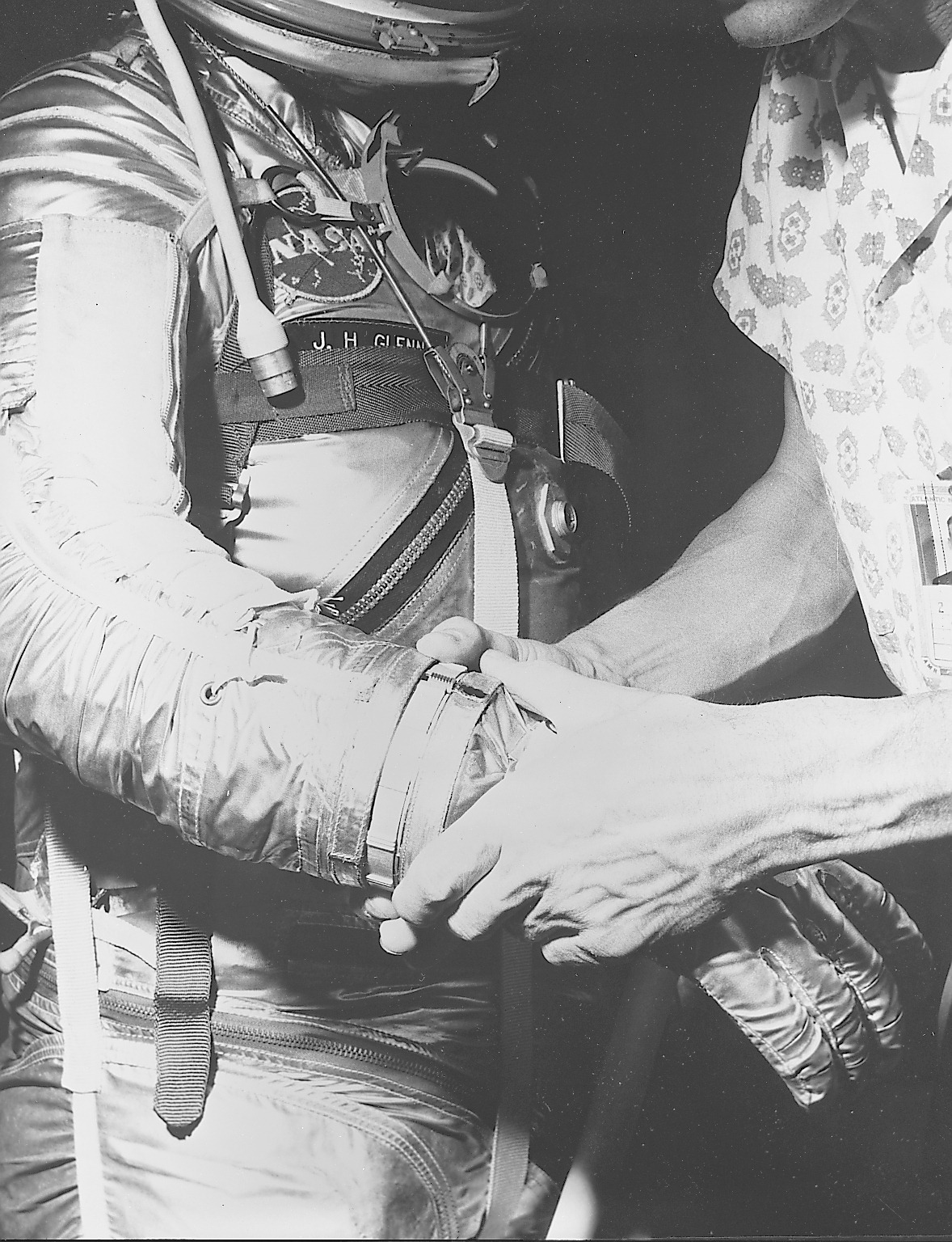 S62-00249 (1962) --- View of astronaut John H. Glenn Jr. being fitted with gloves for his spacesuit during preflight training activities at Cape Canaveral, Florida. Glenn is assisted by suit technician Joe Schmitt. Photo credit: NASA