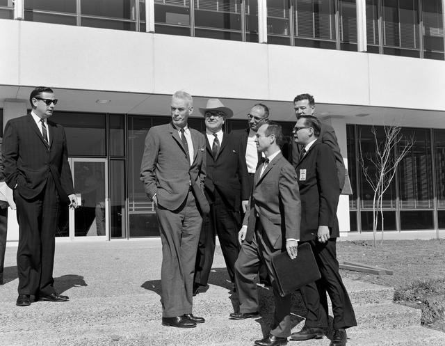 S64-16482 (1964) --- At the Manned Spacecraft Center, Wesley Hjornevik, Assistant Director for Administration, with members of House Subcommittee and MSC Officials outside Central Data Building (Building 12) after briefing. Others pictured are Don Fuqua, Bob Casey, Edward J. Patten, Alec C. Bond, Maxime Faget, Wesley Hjornevik, Charles W. Mathews. Photo credit: NASA