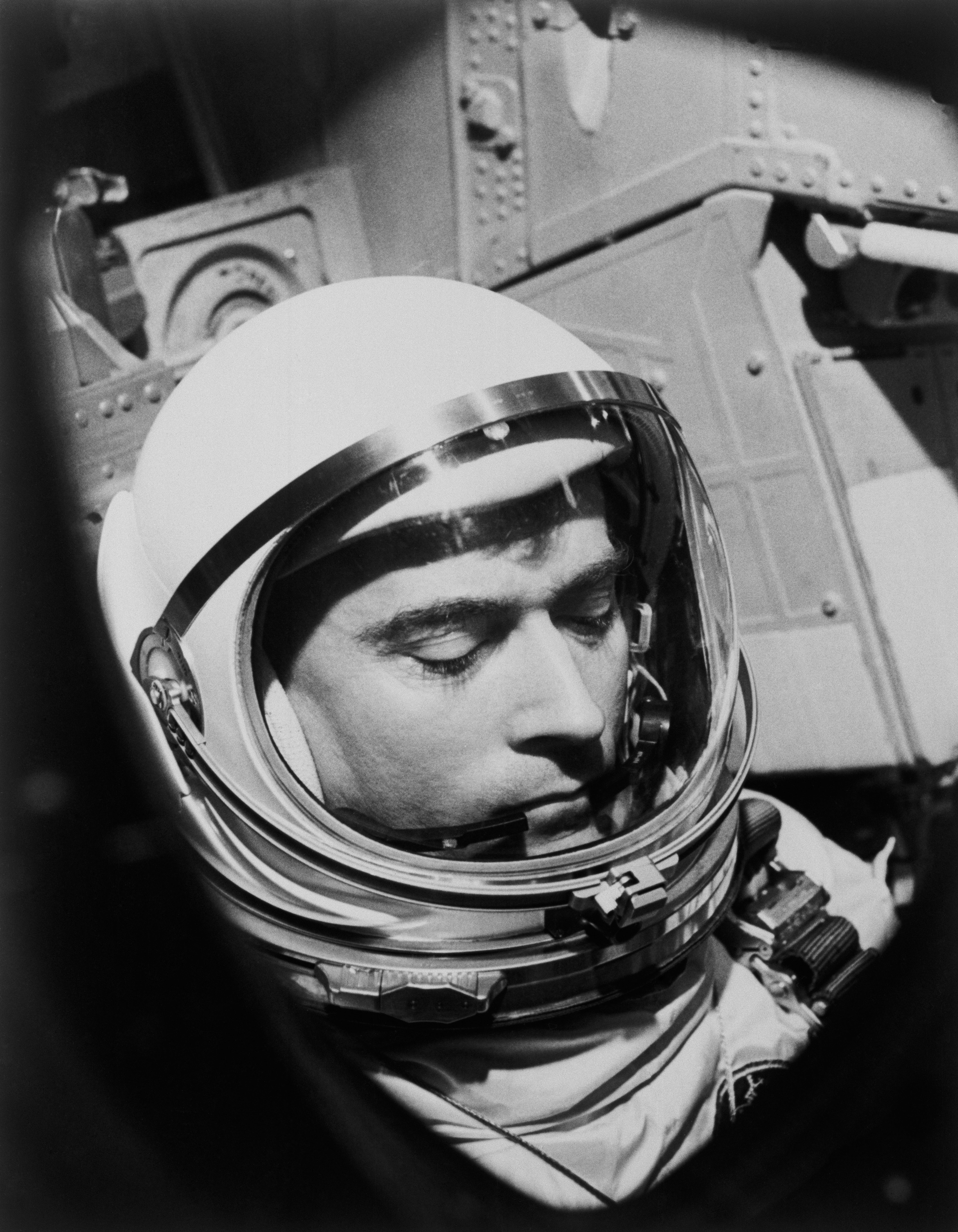 S65-19228 (23 March 1965) --- Astronaut John W. Young, the pilot of the Gemini-Titan 3 mission, is shown going through last minute checks before the hatch is closed on the spacecraft. The window frames Young just before the launch.