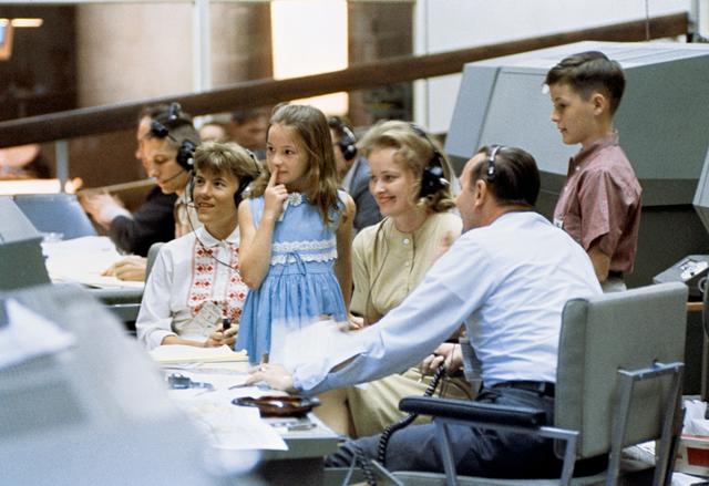 S65-30411 (9 June 1965) --- The families of Gemini 4 astronauts James A. McDivitt and Edward H. White II visited the Mission Control Center in Houston. In the foreground, left to right, are Mrs. Patricia McDivitt, daughter Bonnie White, Mrs. Patricia White, flight director Christopher C. Kraft Jr., and Edward White III. Each of the family members talked with the astronauts as they passed over the United States. Photo credit: NASA