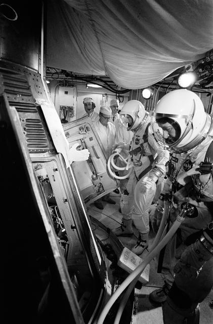 S65-66744 (15 Dec. 1965) --- Insertion of astronauts Walter M. Schirra Jr. (foreground) and Thomas P. Stafford into Gemini-6 spacecraft prior to launch. Photo credit: NASA or National Aeronautics and Space Administration
