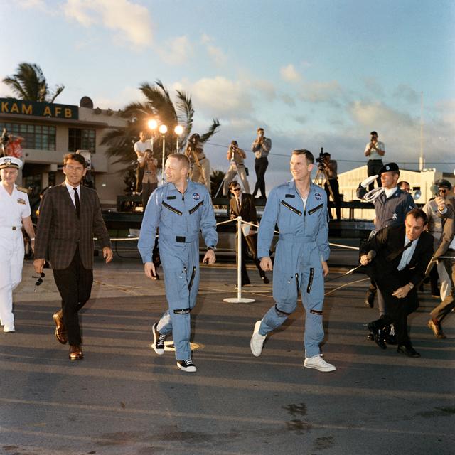 S66-18607 (18 March 1966) --- Astronauts Neil A. Armstrong (center), Gemini-8 command pilot, and David R. Scott, pilot, arrive at Hickam Field, Hawaii on their way from Naha, Okinawa, to Cape Kennedy, Florida. Astronaut Walter M. Schirra Jr. is at extreme left. Photo credit: NASA