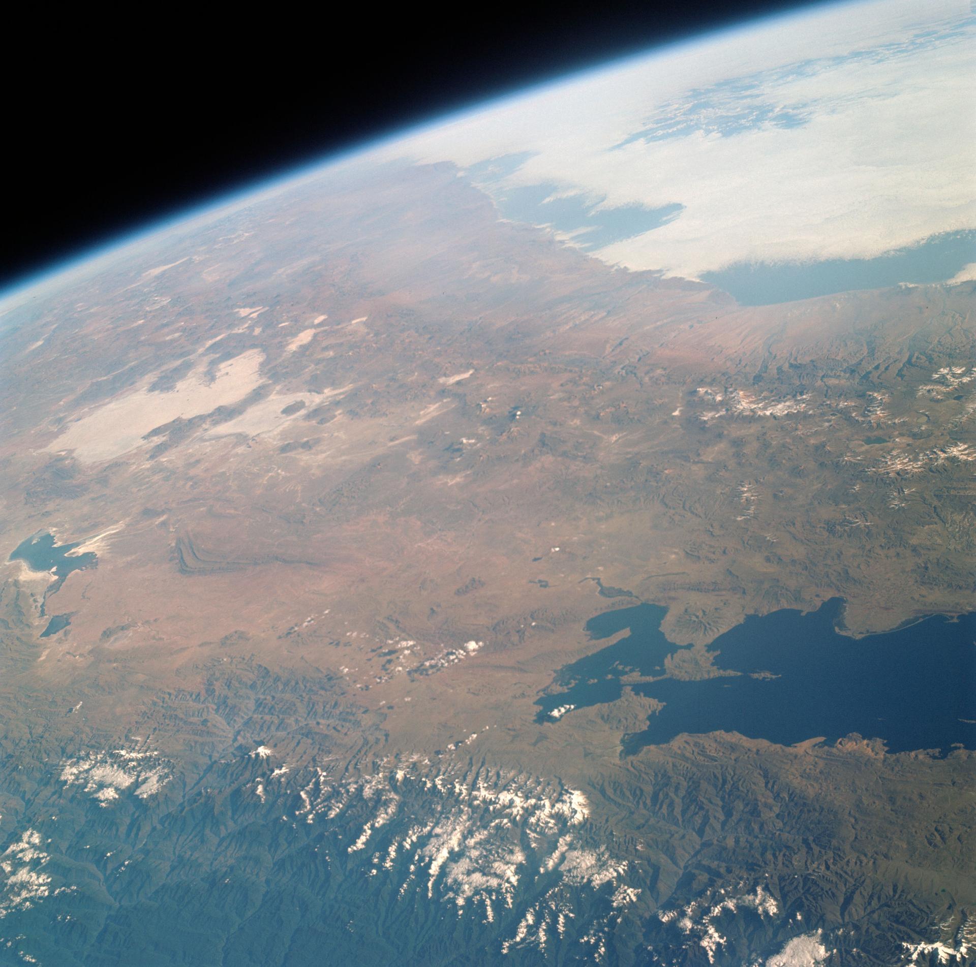 S66-38313 (5 June 1966) --- Areas of Peru (upper right), Chile (top center) and Bolivia as seen from the Gemini-9 spacecraft during its 35th revolution of Earth. The large body of water at lower right is Lake Titicaca. The smaller lake at left edge is Lake Poopo. Salar de Uyuni is the large light-colored area at upper left. At the bottom of the picture is the snow-capped Cordillera Real range of the Andes Mountains. The Pacific coastline of Peru and Chile is at upper right. The range running parallel with the coastline is the Cordillera Occidental. The image was taken with a modified 70mm Hasselblad camera, using Eastman Kodak, Ektachrome MS (S.O. 217) color film. Photo credit: NASA