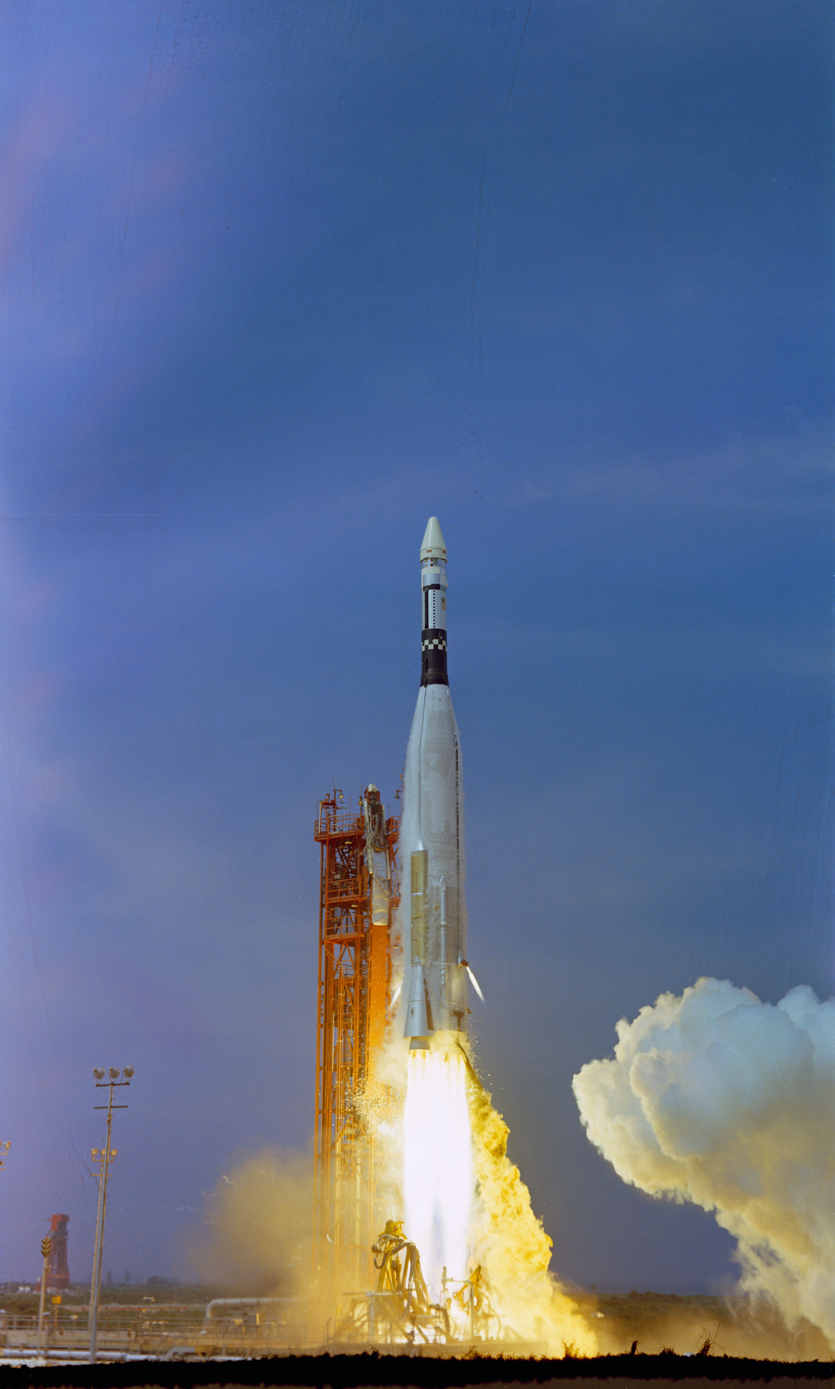 S66-42751 (18 July 1966) --- An Agena Target Docking Vehicle atop its Atlas launch vehicle was launched from the Kennedy Space Center's Launch Complex 14 at 3:39 p.m. (EST), July 18, 1966. The Gemini-10 liftoff followed the Agena liftoff by 101 minutes. The Agena served as a rendezvous and docking vehicle for the Gemini-10 spacecraft. Photo credit: NASA