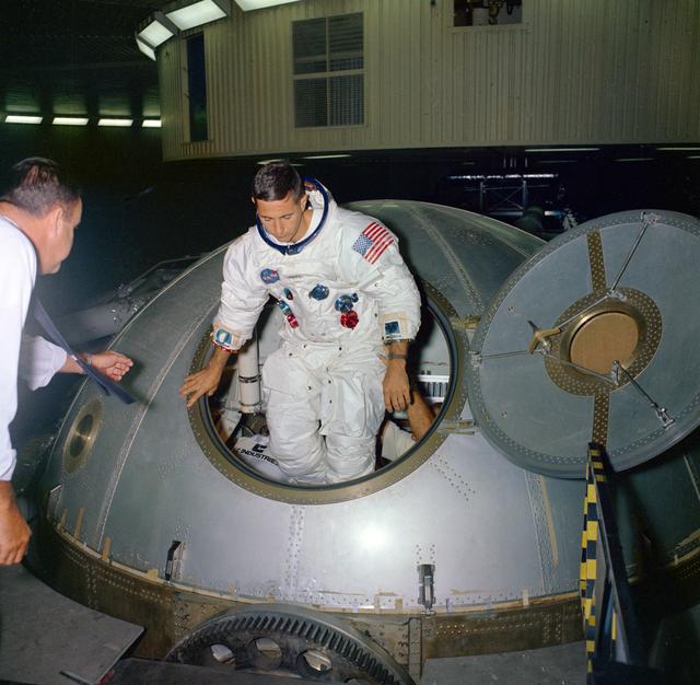 Apollo 8 astronaut William A. Anders, lunar module pilot, steps out of the centrifuge gondola in bldg 29 during centrifuge training in the Manned Spacecraft Center's (MSC) Flight Acceleration Facility.