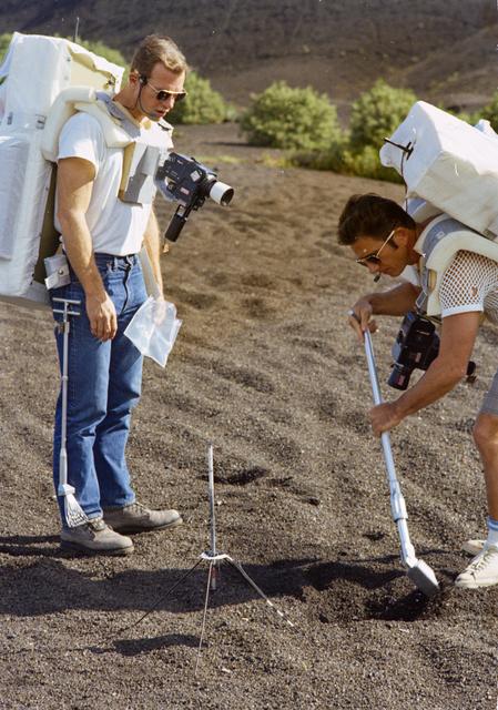 S70-56415 (December 1970) --- At Kapoho, Hawaii, astronauts David R. Scott (left), commander of the Apollo 15 lunar landing mission, and James B. Irwin, lunar module pilot, train at a designated lunar surface simulation area for their upcoming lunar landing mission. Wearing street clothes, but equipped with a Portable Life Support System (PLSS), the two rehearse for a selenological traverse. Here, they are inspecting a grapefruit-sized rock. Photo credit: NASA