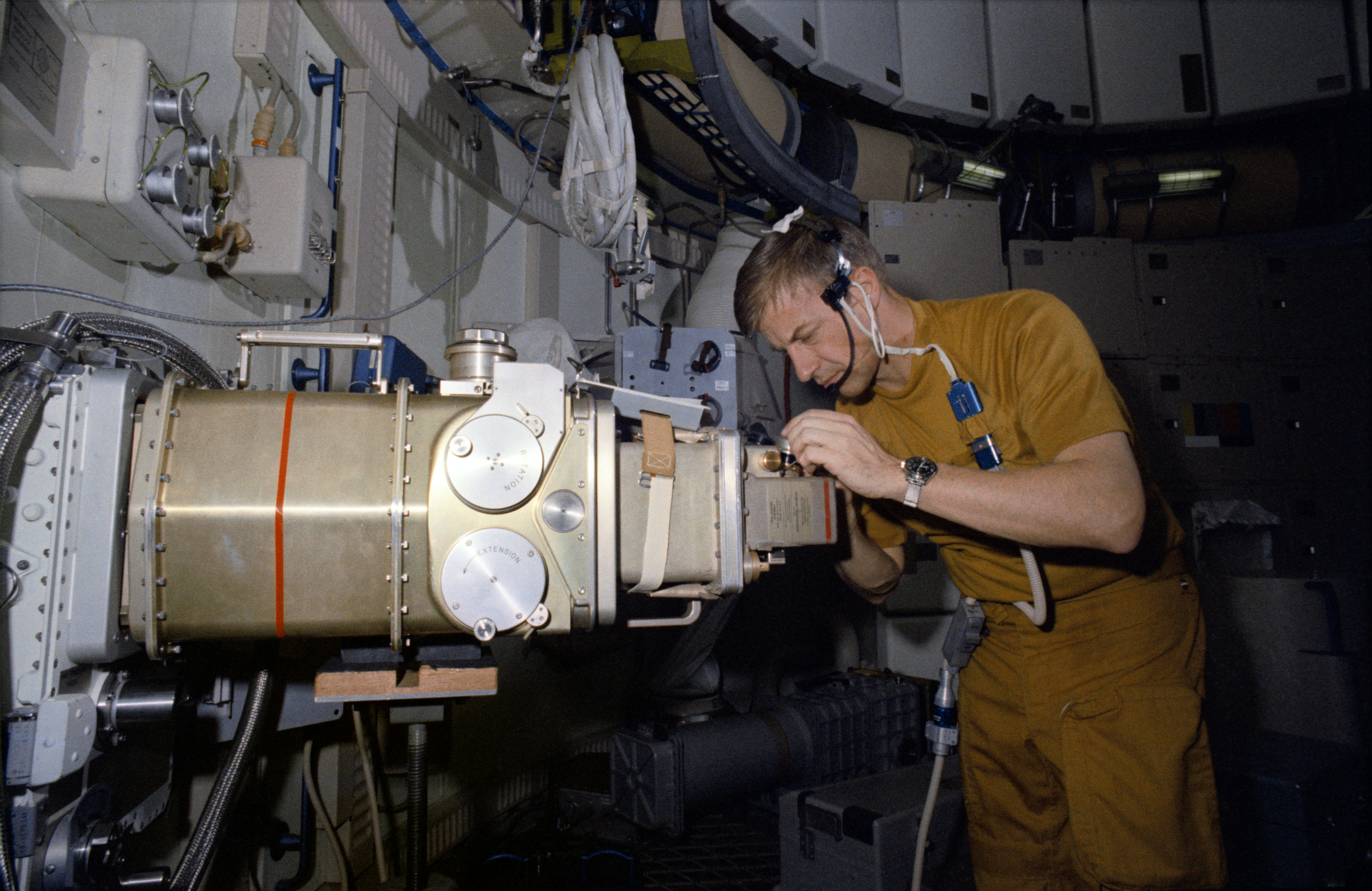 S73-20716 (1 March 1973) --- Astronaut Paul J. Weitz, pilot of the first manned Skylab mission, works with the UV Stellar Astronomy Experiment S019 in the forward compartment of the Skylab Orbital Workshop (OWS) trainer during Skylab training at Johnson Space Center. The equipment consists of a reflecting telescope, a 35mm camera and an additional mirror. It is mounted in an anti-solar scientific airlock in the side of the OWS. Photo credit: NASA
