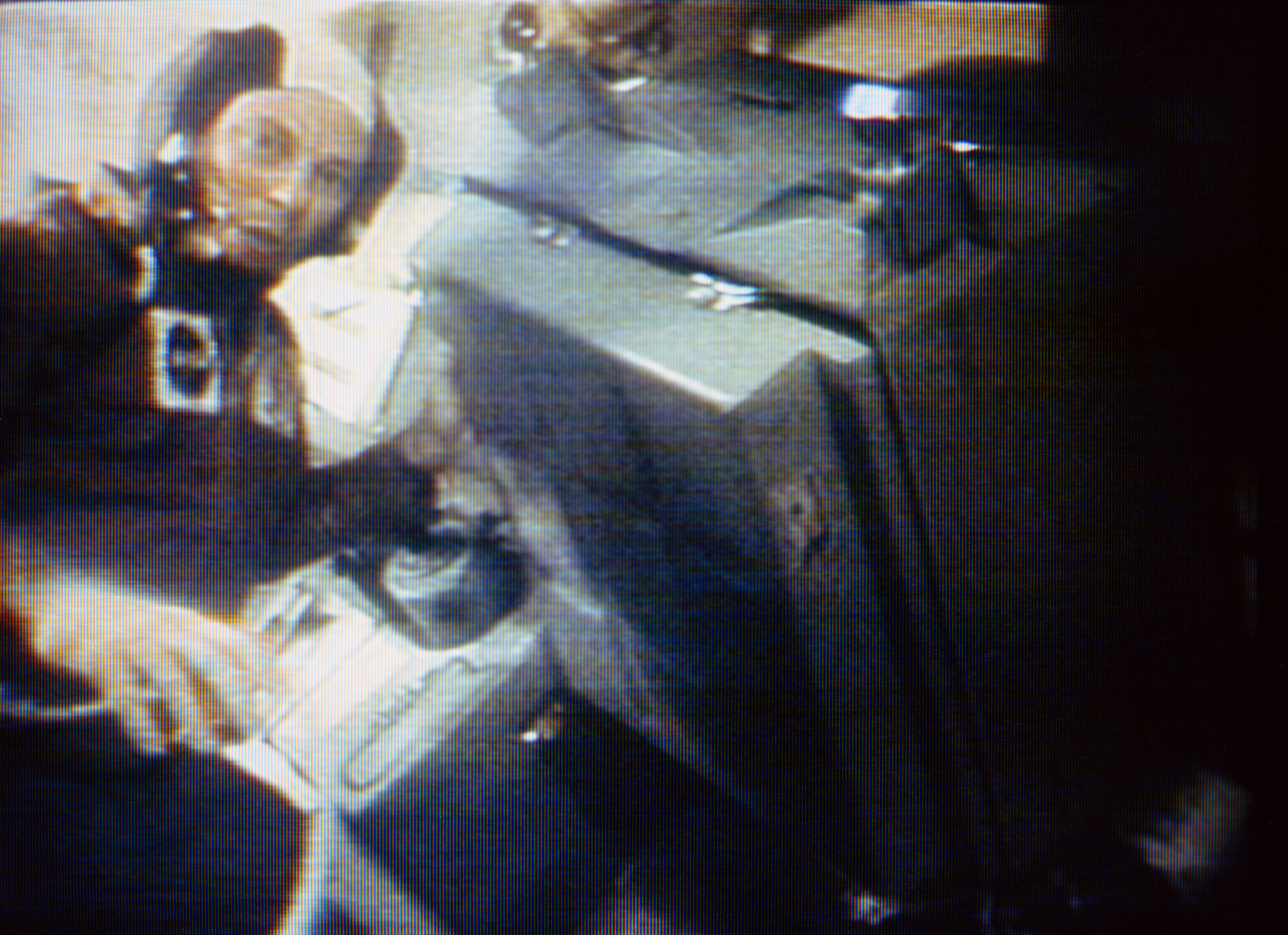 S73-34181 (July-September 1973) --- Astronaut Jack R. Lousma, Skylab 3 pilot, works at the S190A multispectral camera experiment in the Multiple Docking Adapter (MDA), seen from a color television transmission made by a TV camera aboard the Skylab space station cluster in Earth orbit. Lousma later used a small brush to clean the six lenses of the multispectral camera. Photo credit: NASA