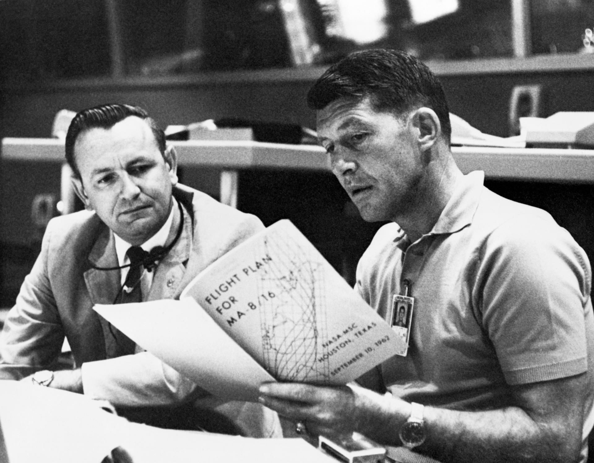 S74-33004 (19 Sept. 1962) --- Astronaut Walter M. Schirra Jr, (right), Mercury-Atlas 8 (MA-8) pilot, discusses the MA-8 flight plan with flight director Christopher C. Kraft Jr., Chief of the Flight Operations Division at the Manned Spacecraft Center, Houston, during MA-8 preflight preparations at Cape Canaveral, Florida. They are seated at a console in the Mercury Control Center. Photo credit: NASA
