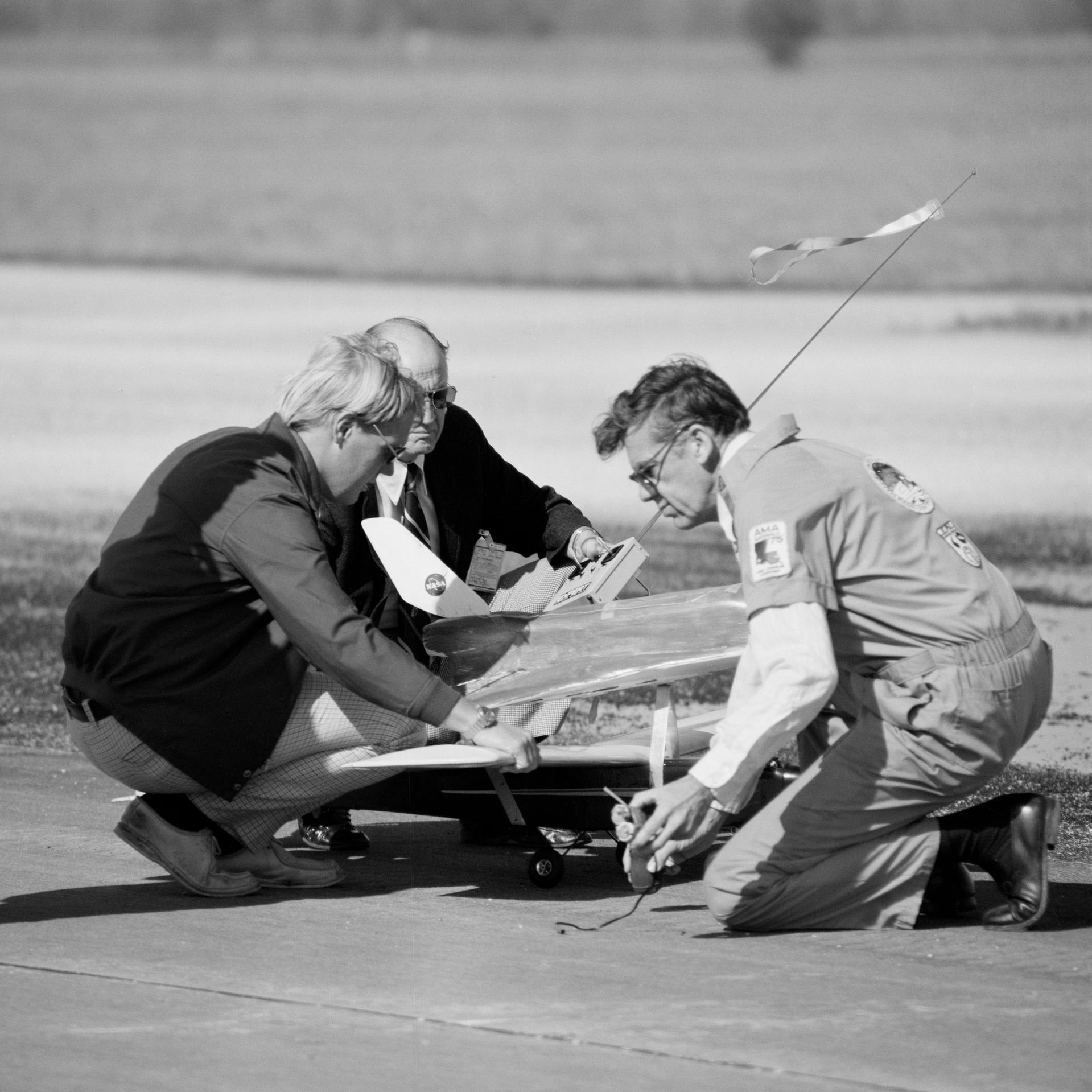 Seen left to right is Art Arrow,Owen Morris, and John Kiker. This is an image in a series of photographs documenting a " mini "Approach and Landing Test conducted on the Bldg. 14 Antenna Test Range, using a 1/40th-scale model Orbiter and a model airplane. The test was flown to study Orbiter control characteristics and separation dynamics. Simulated Orbiter being dropped from 747. JSC, HOUSTON, TX. S75-33949 thru S75-33957