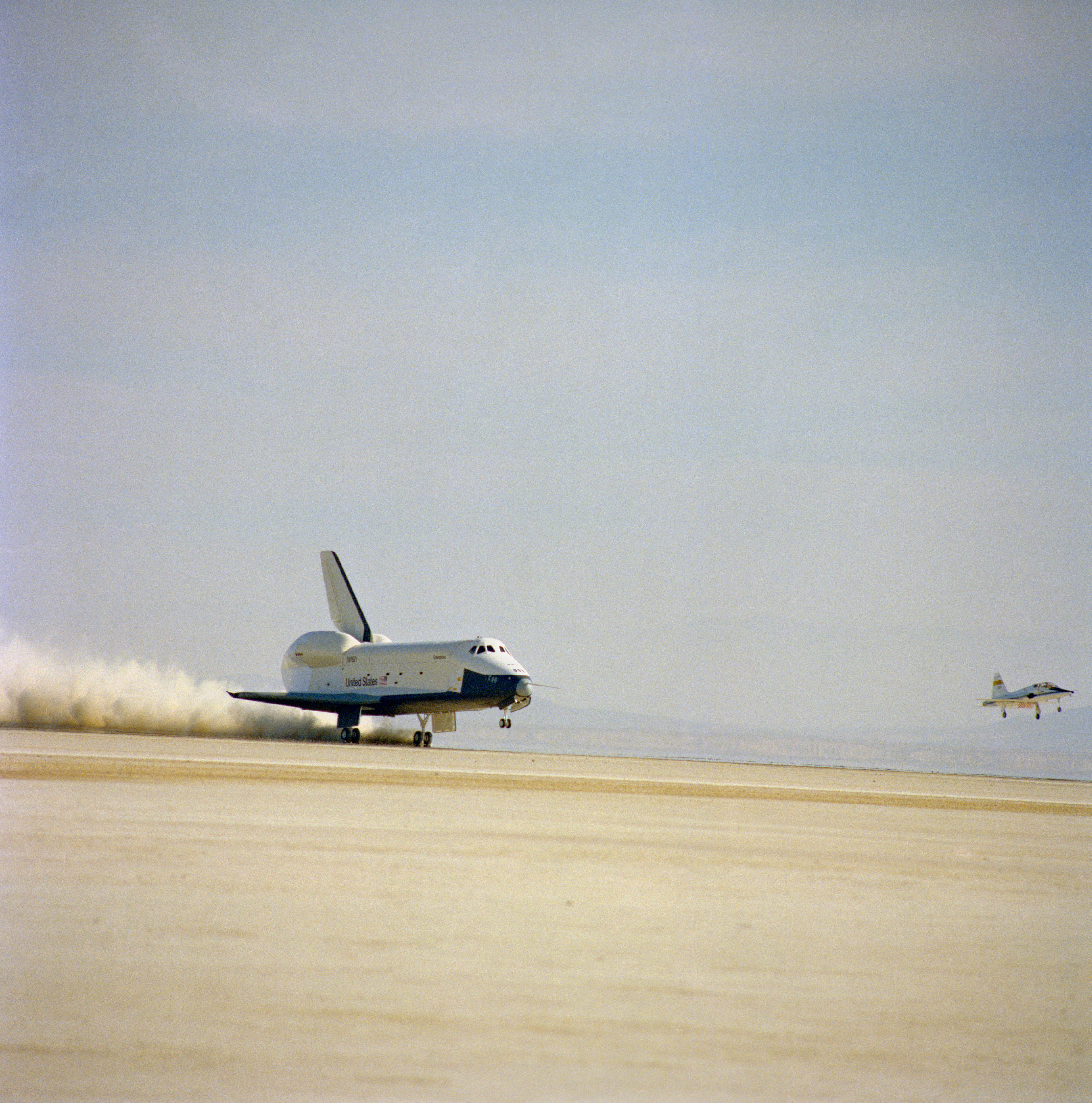 S77-28144 (13 Sept 1977) --- The shuttle orbiter 101 "Enterprise" stirs up a cloud of desert sand and dust as it lands to conclude a five-minute, 28-second unpowered flight during the second free flight of the Shuttle Approach and Landing Tests (ALT) conduced on September 13, 1977 at the Dryden Flight Research Center in Southern California. The Orbiter 101 crew astronauts Joe H. Engle, commander, and Richard H. Truly, pilot. The ALT free flights are designed to verify orbiter subsonic airworthiness, integrated systems operations and pilot-guided approach and landing capability and satisfy prerequisites to automatic flight control and navigation mode. On the right a T-38 chase plane comes in for a landing, also. This picture was taken with an Air Force Test Center 70mm Hasselblad camera installed on a tracking mount parked on the lake bed.