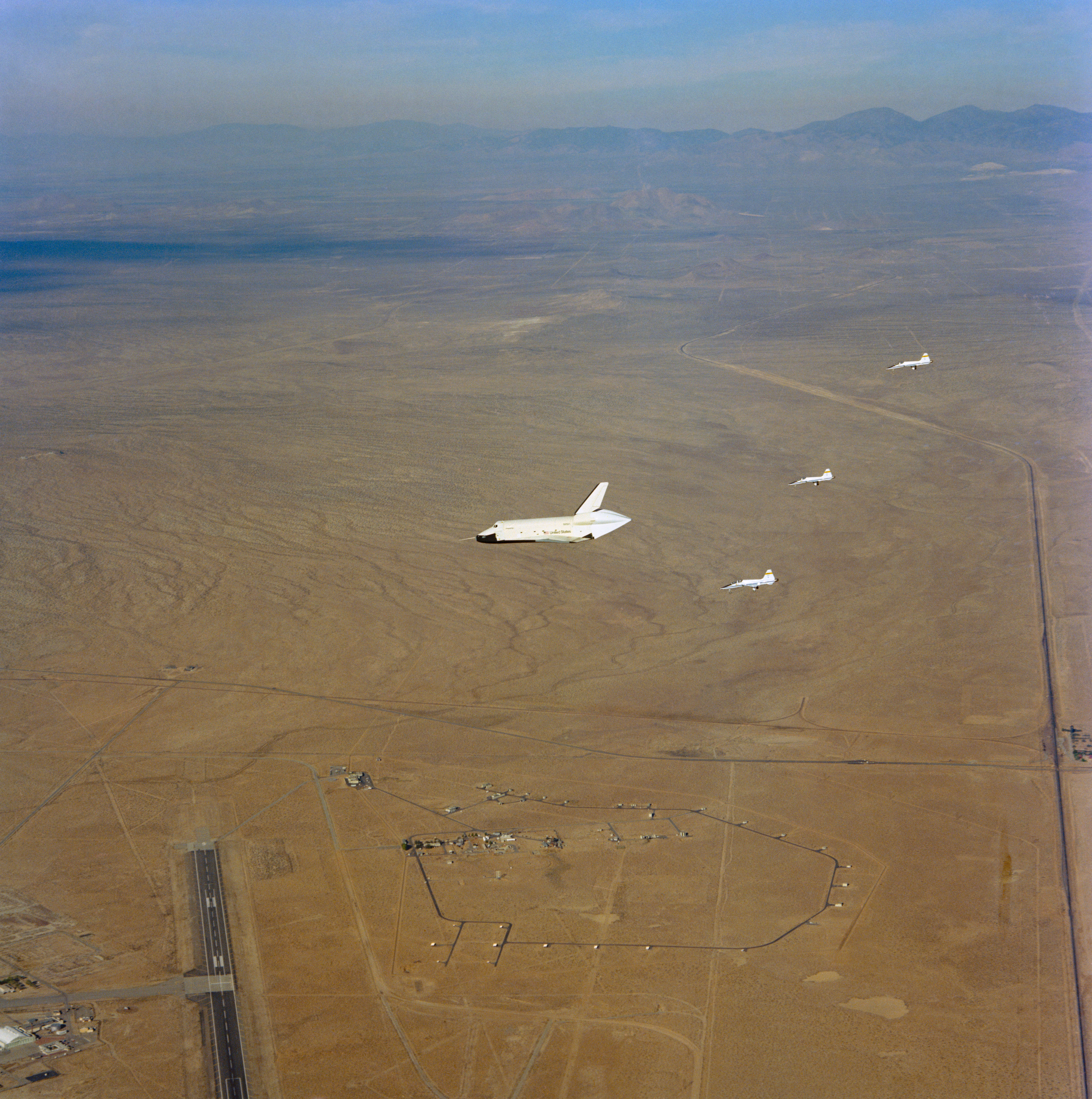 S77-28667 (23 Sept 1977) --- The shuttle Orbiter 101 "Enterprise" soars above the North Base area of Edwards Air Force Base during its five-minute, 34-second unpowered flight, the third of a series of manned Shuttle Approach and Landing Tests (ALT). Moments earlier the "Enterprise" had separated from its 747 carrier aircraft, atop which it sat upon takeoff from the Dryden Flight Research Center (DFRC), with its crew of astronauts Fred W. Haise Jr., commander, and C. Gordon Fullerton, pilot. Three T-38 chase planes follow. This photograph was taken from a fourth T-38 chase plane.