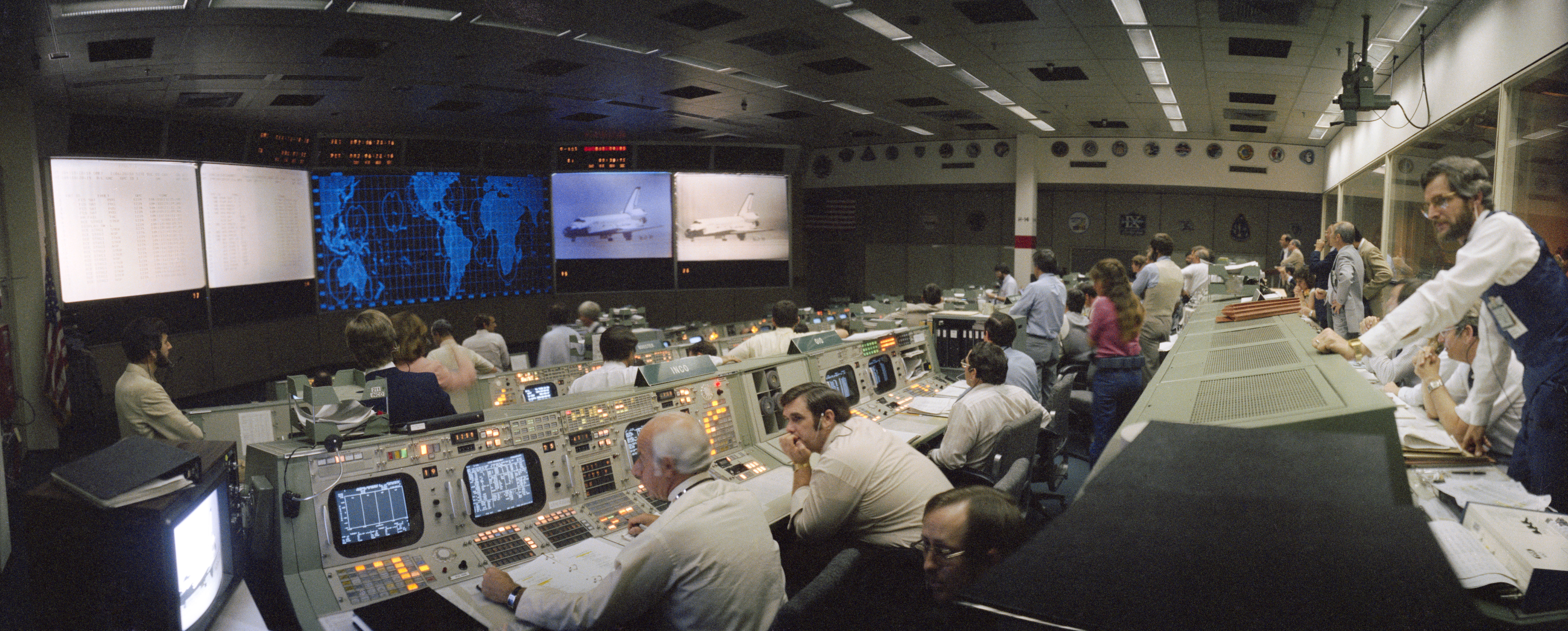S81-30387 (14 April 1981) --- An overall view of the mission operations control room (MOCR) in the Johnson Space Center's Mission Control Center during the landing phase of the STS-1 mission. The Columbia can be seen on large monitor in upper right at Dryden Flight Research Center. Flight controller Ed Fendell, left foreground, mans the integrated communications systems engineer (INCO) console. Photo credit: NASA