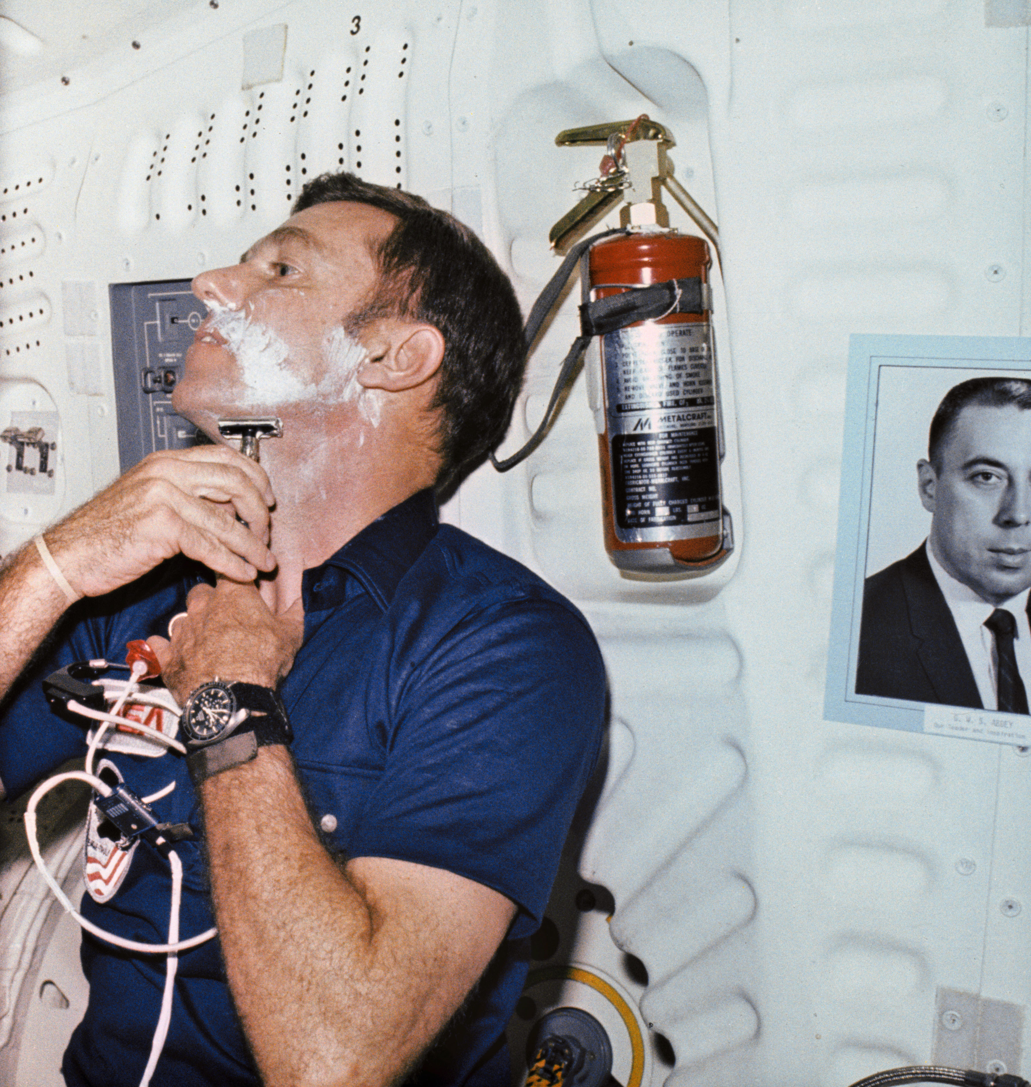 S81-39573 (12-14 Nov. 1981) --- This photograph was taken during a two-and a fourth-day stay in Earth orbit by astronauts Joe H. Engle, here shaving, and Richard H. Truly, photographer for this frame. A portion of that time was spent in the living area of middeck portion of the 122-ft-long (37 meters) vehicle as the astronauts ate, slept and took care of hygiene matters here. An onboard fire extinguisher is in upper right corner. Partially out of the frame at right edge is a photograph of George W. S. Abbey, Director of Flight Operations at Johnson Space Center. Engle is attired in an onboard constant wear type garment. Photo credit: NASA