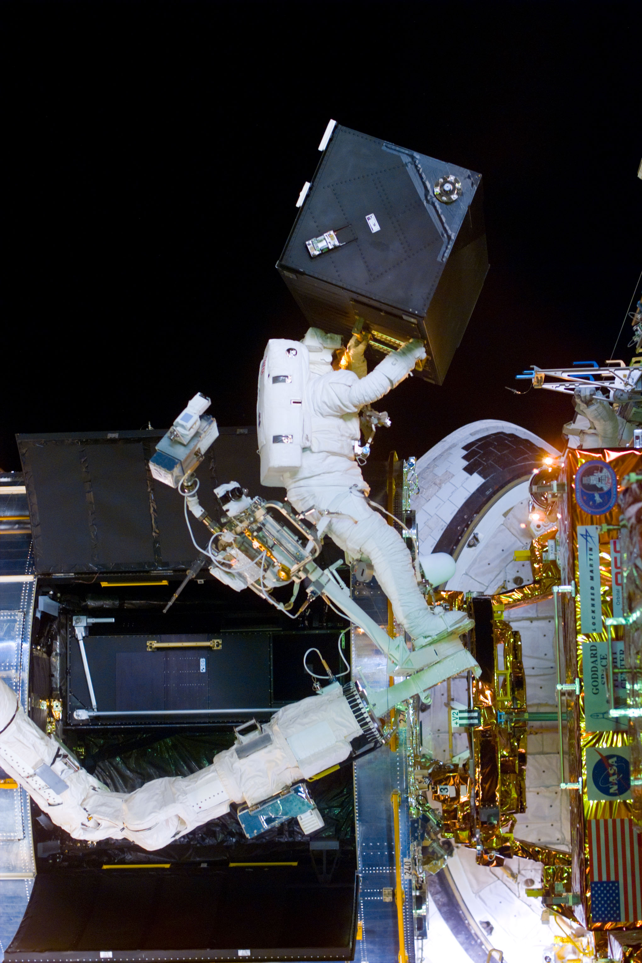 S82-E-5317 (14 Feb. 1997) --- Astronaut Steven L. Smith, STS-82 mission specialist, on arm with Faint Object Spectrograph (FOS) after removal from Hubble Space Telescope (HST). This view was taken with an Electronic Still Camera (ESC).